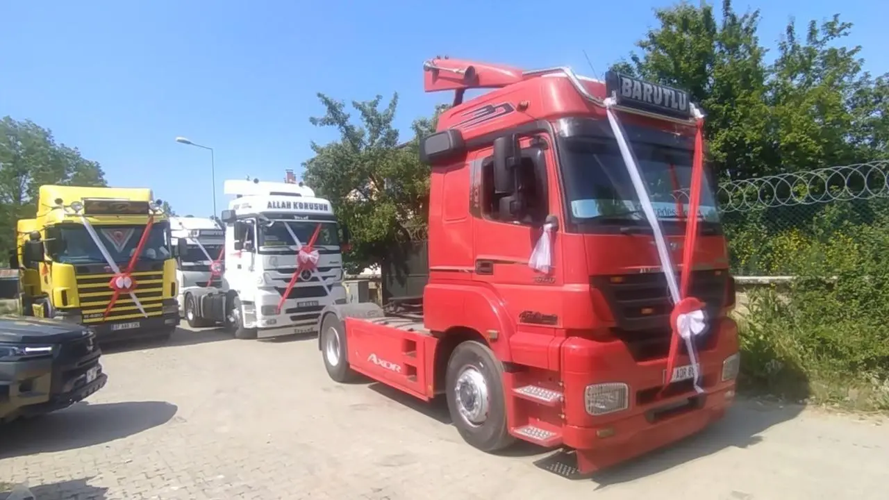 Meslektaşları düğün konvoyunda klaksonlarla kutlama yaptı. Çok sayıda tır şoförü bu özel günde arkadaşlarını yalnız bırakmadı.