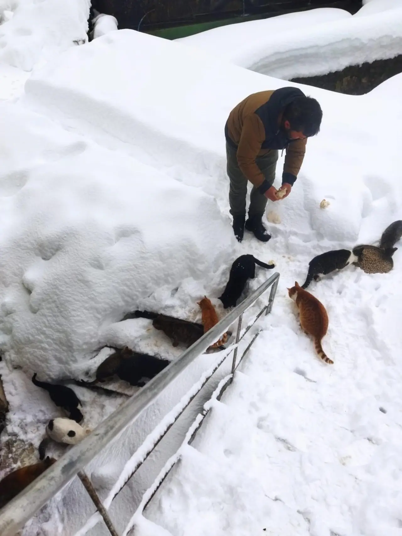 Yukarısökü köyünde yaşayan imam Rıfat Şahin, kedilere seslenerek onları çağırdı. Boylarını aşan karda zorlukla yürüyen kediler, imamın yanına gelmek için sıraya girdi.