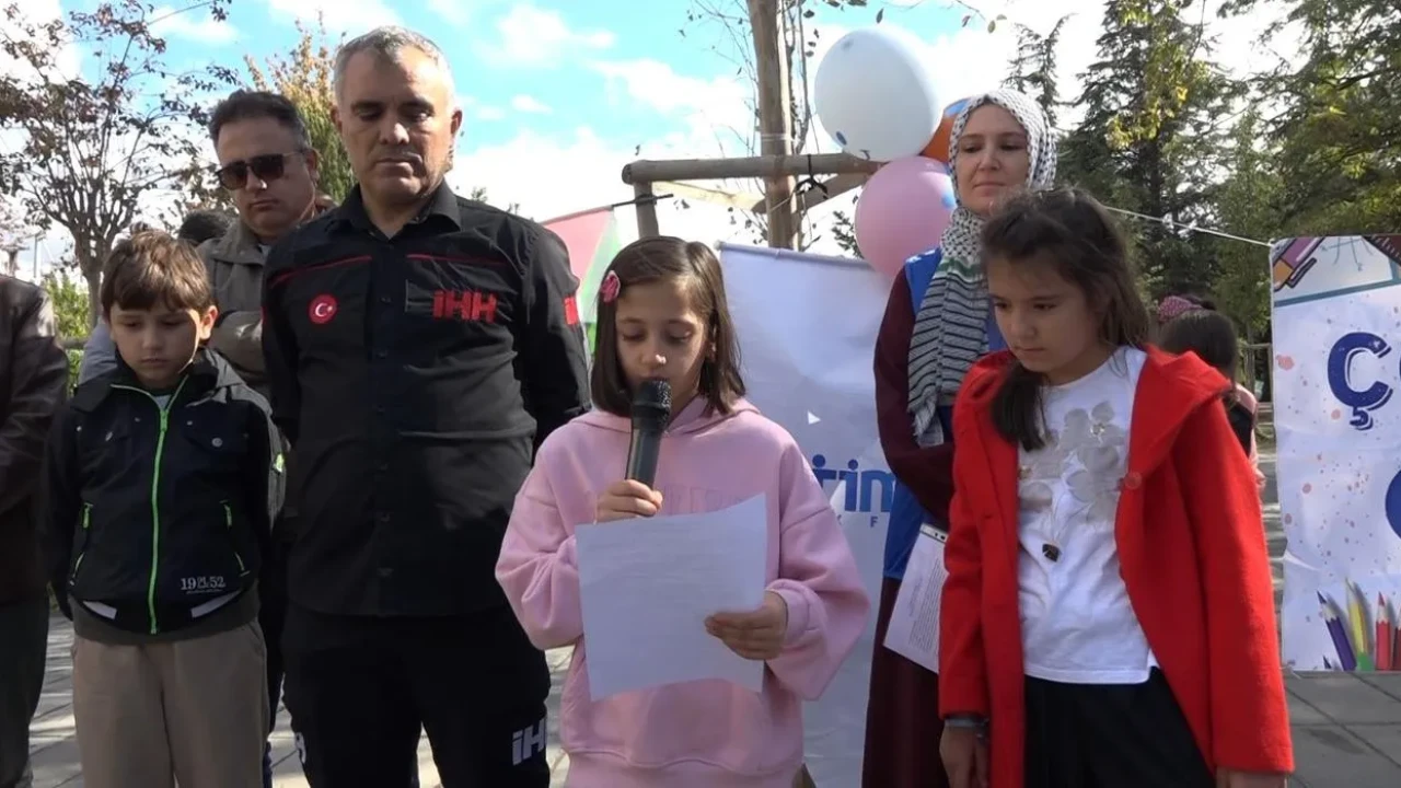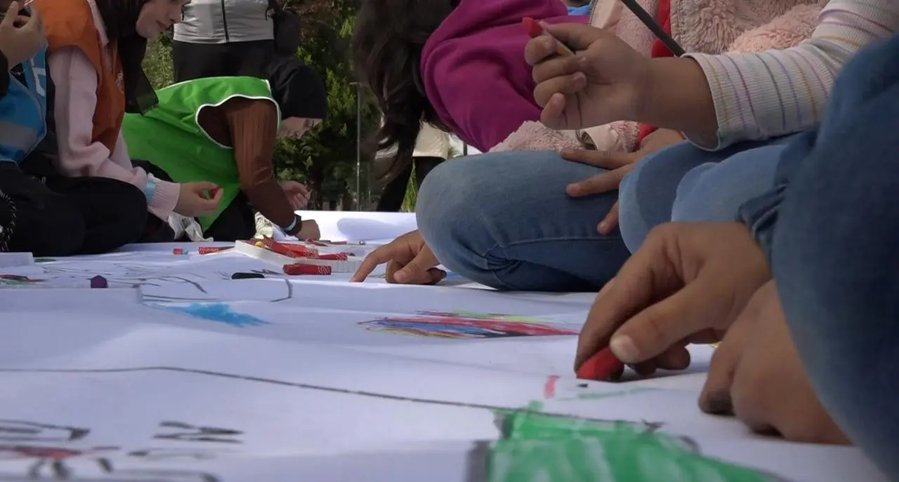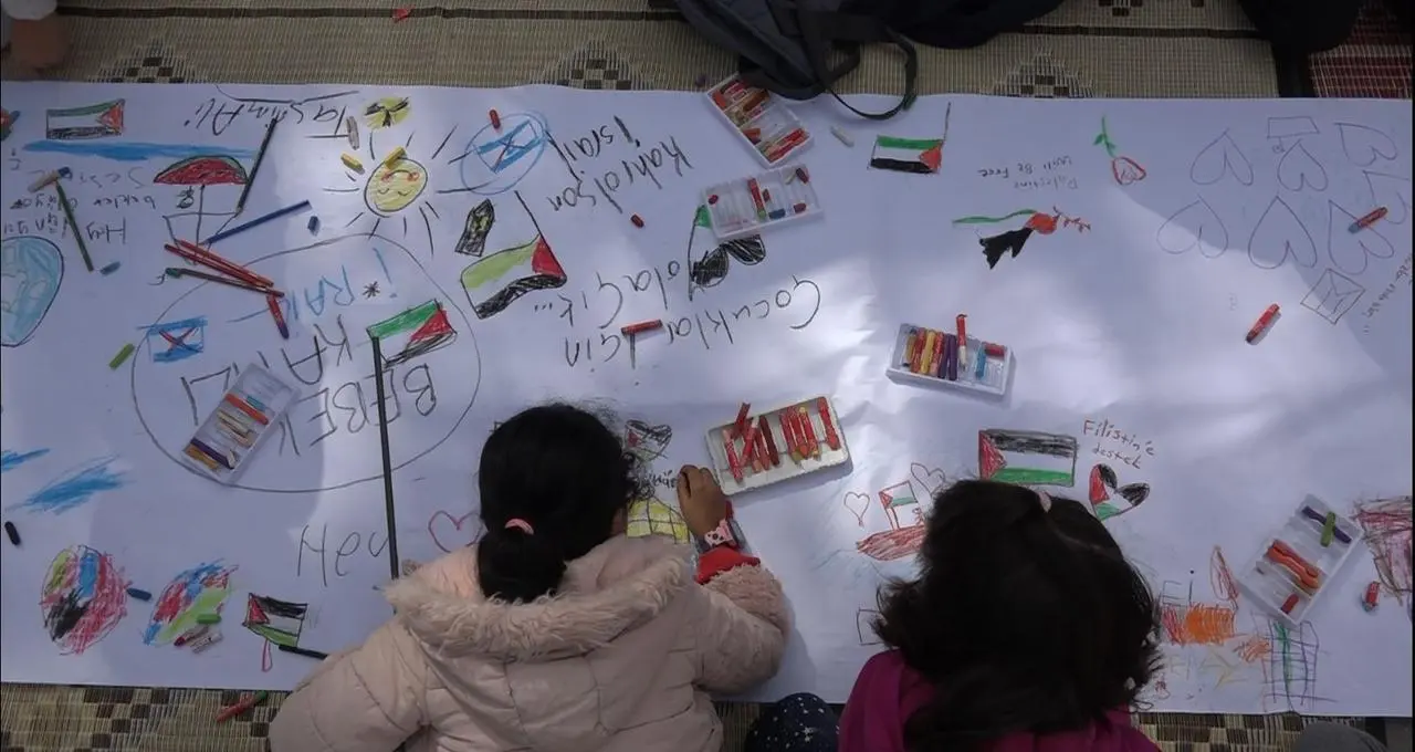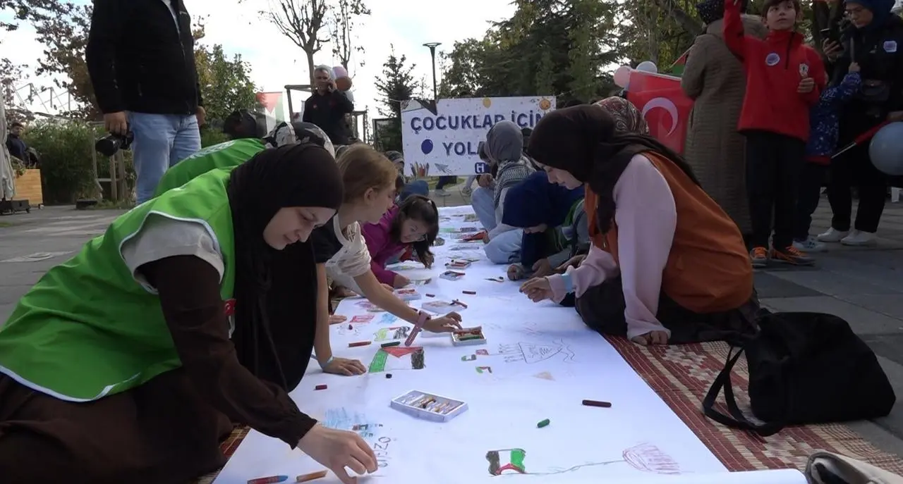 Milat Bahçesi'nde düzenlenen etkinlikte çocuklar Filistinli akranlarına destek mesajları yazdı. Renkli boyalarla dolu tuvaller umut ve barış temalı çizimlerle doldu.