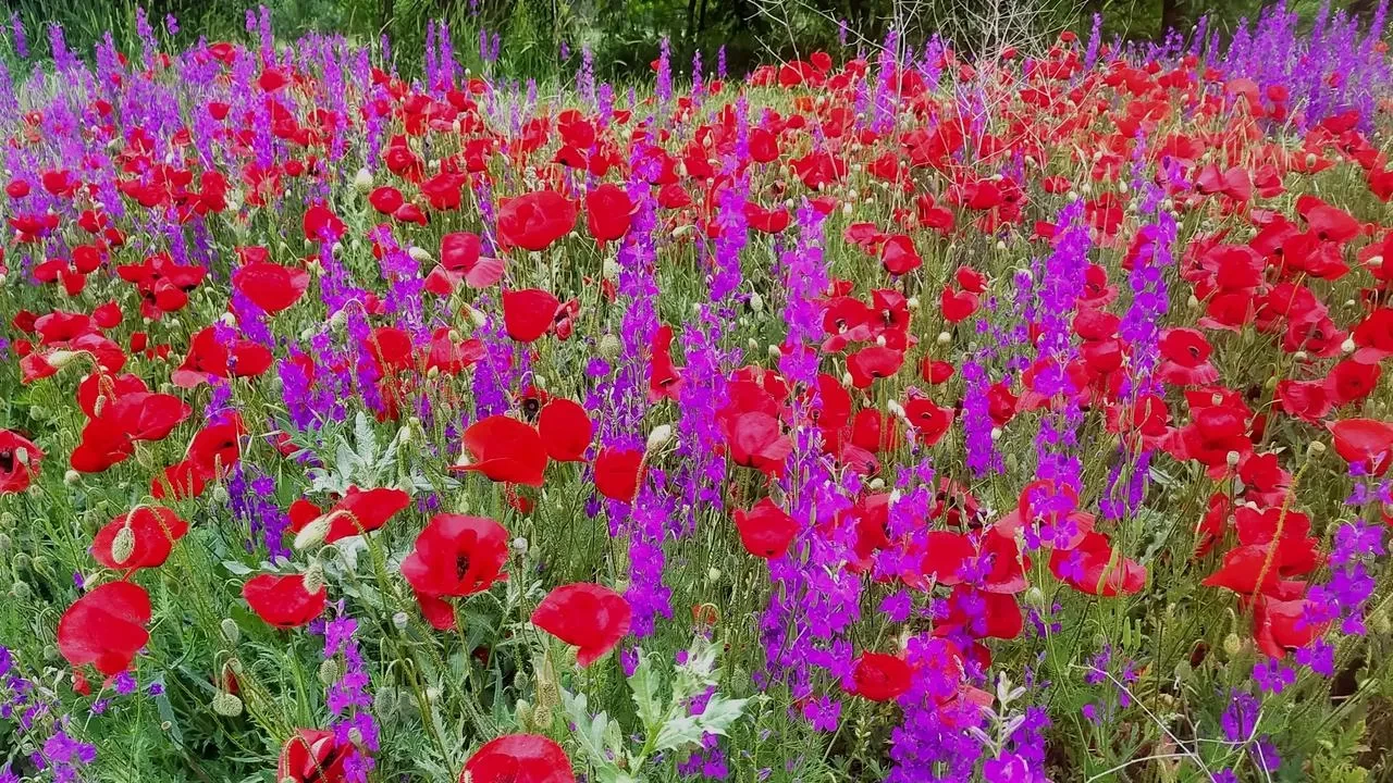 Kütahya'nın Hisarcık ilçesinde bahar yağmurlarıyla birlikte tarlalar mor ve kırmızı çiçeklerle bezendi.