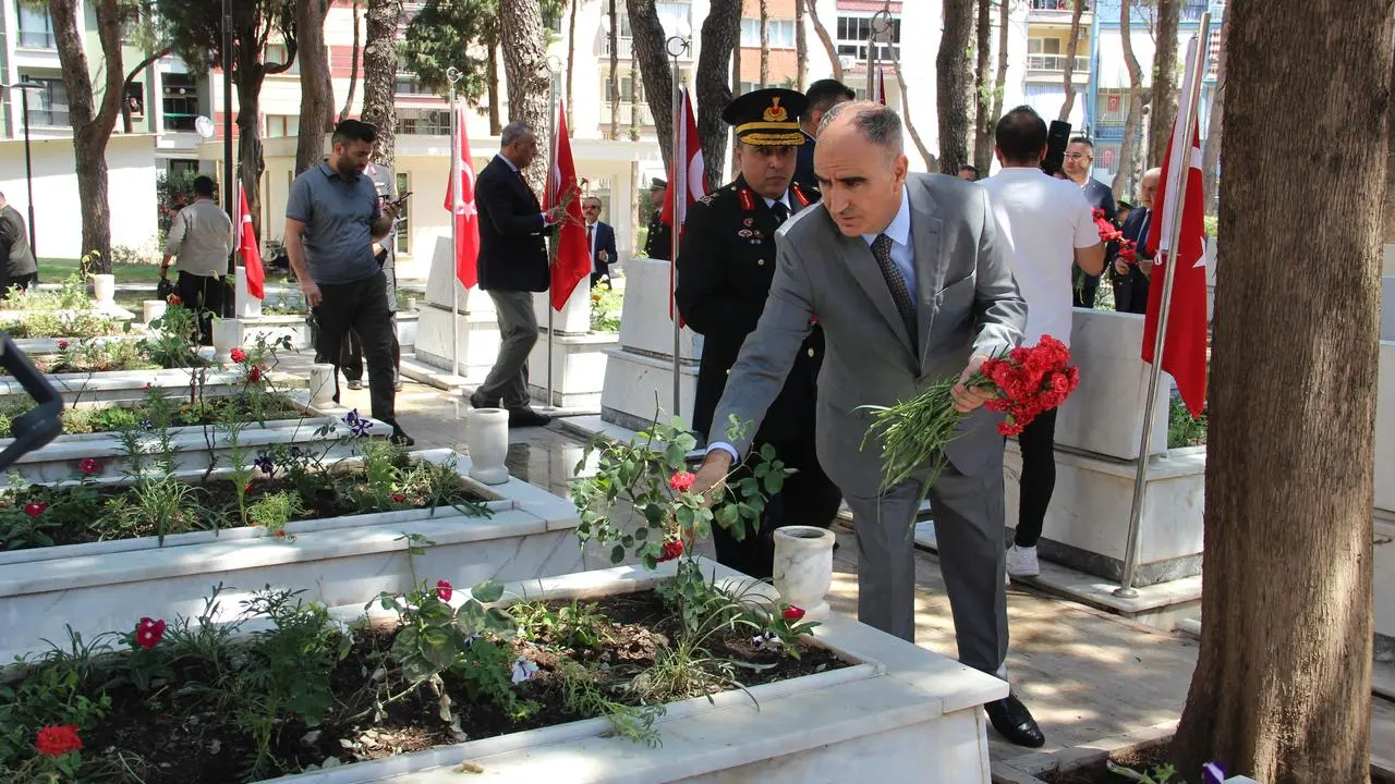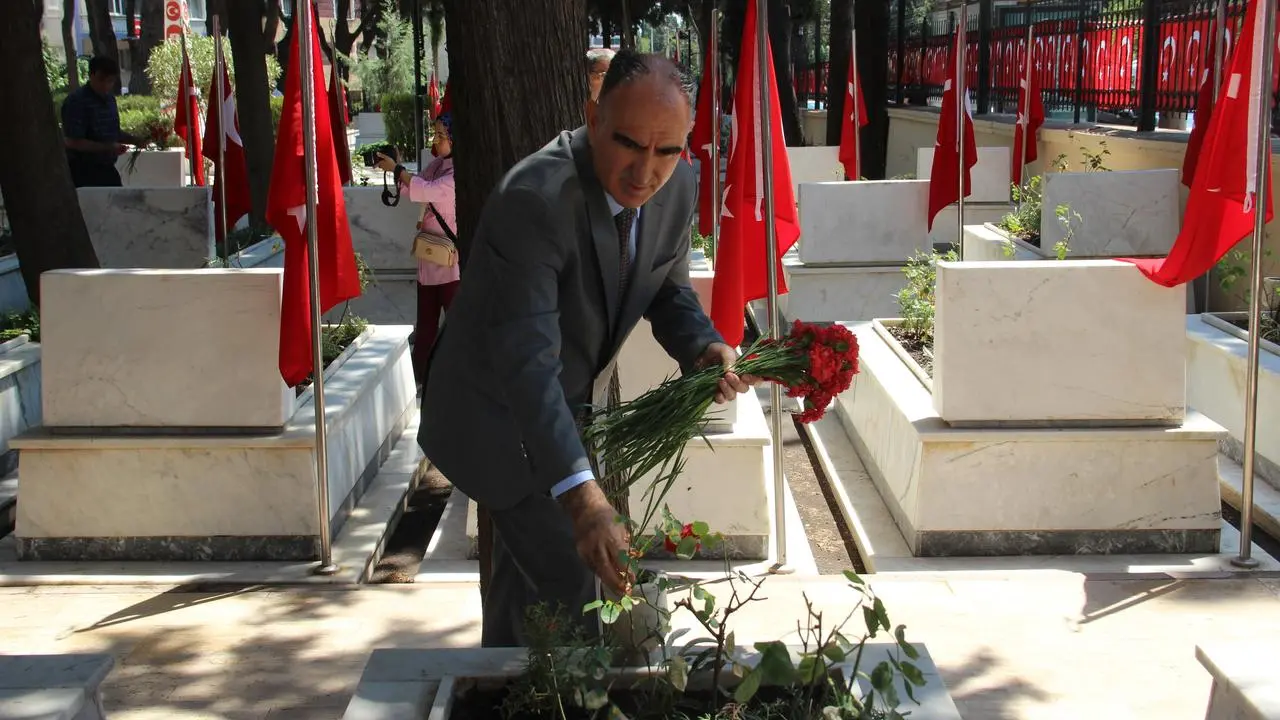 Manisa Valisi Vahdettin Özkan ve protokol üyeleri, Garnizon Şehitliği'nde şehitler için karanfil bıraktı. Kur'an-ı Kerim tilaveti ve duaların ardından şehit yakınlarıyla bir araya gelindi.