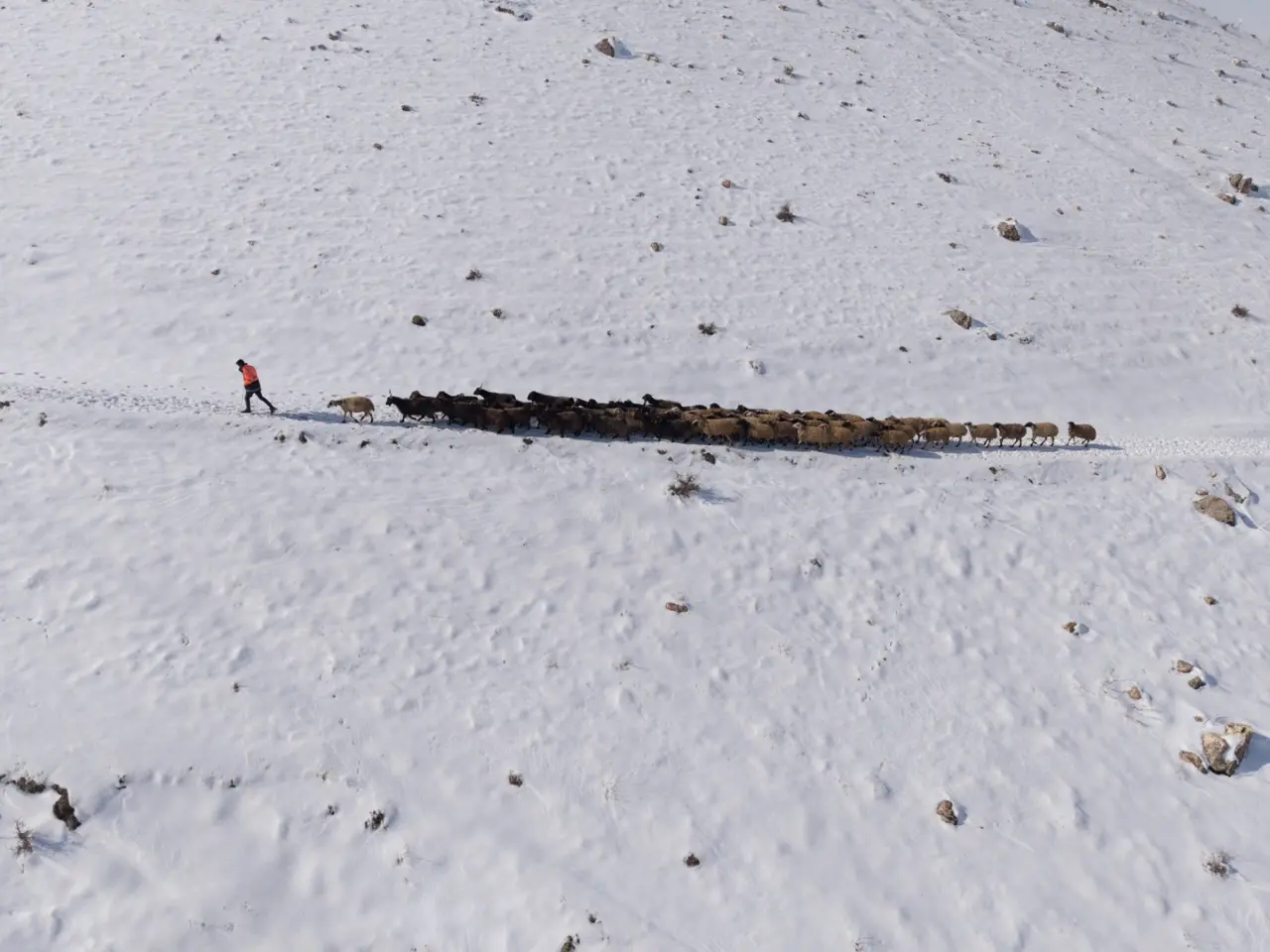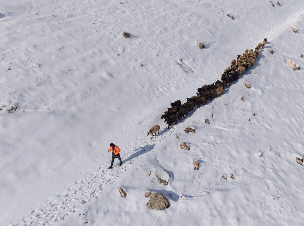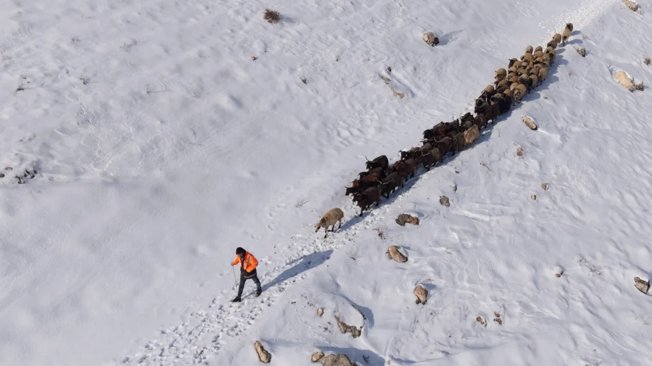 Havadan görüntülenen sahnelerde çoban ve sürüsü, karla kaplı tepelerde iz bırakarak ilerliyor. Engebeli arazi ve soğuk havaya rağmen üreticiler geçim kaynakları için çaba gösteriyor.