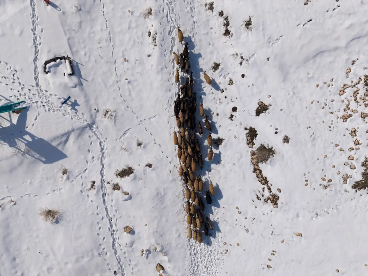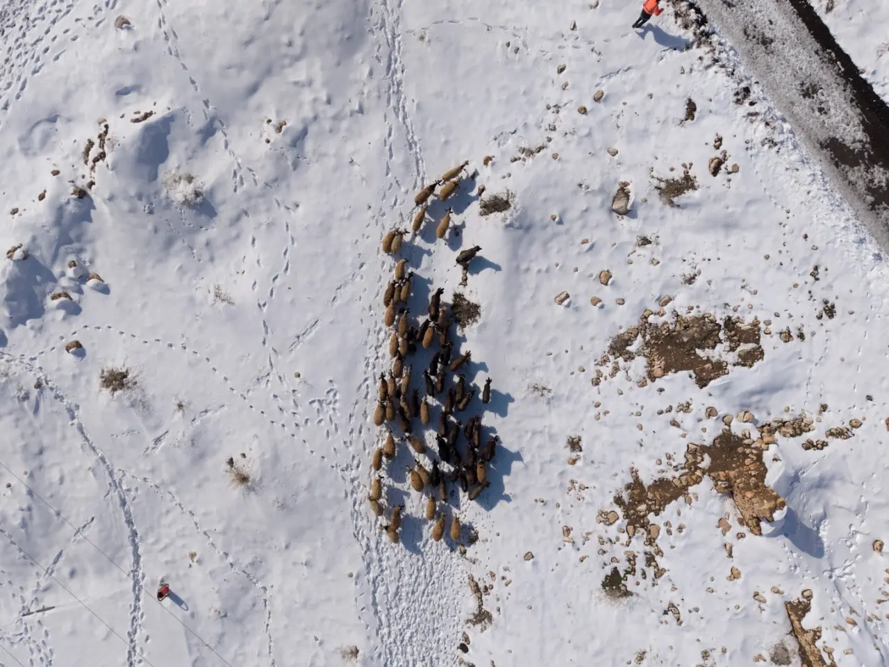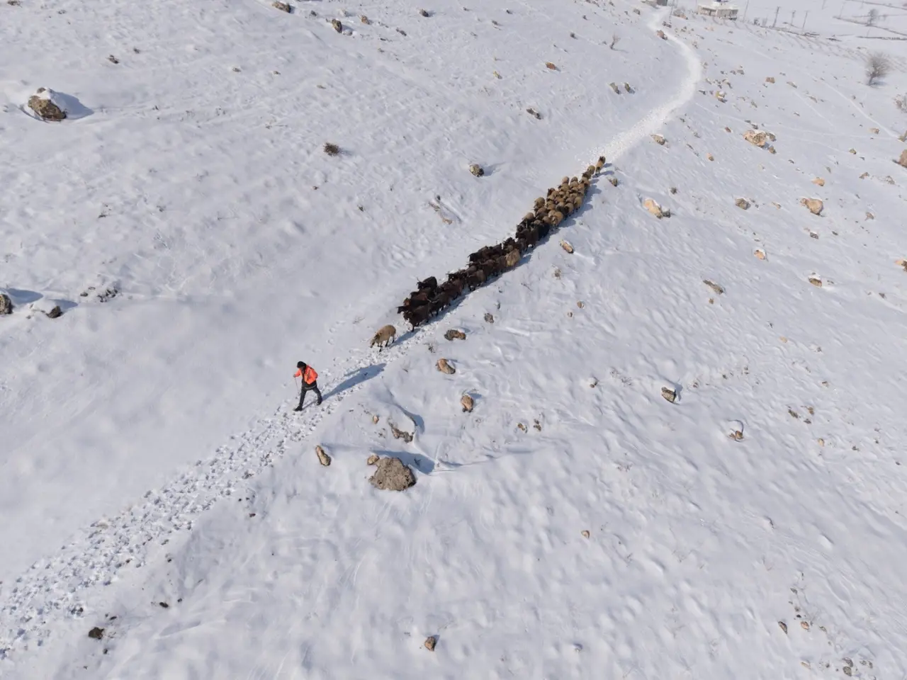 Havadan görüntülenen sahnelerde çoban ve sürüsü, karla kaplı tepelerde iz bırakarak ilerliyor. Engebeli arazi ve soğuk havaya rağmen üreticiler geçim kaynakları için çaba gösteriyor.