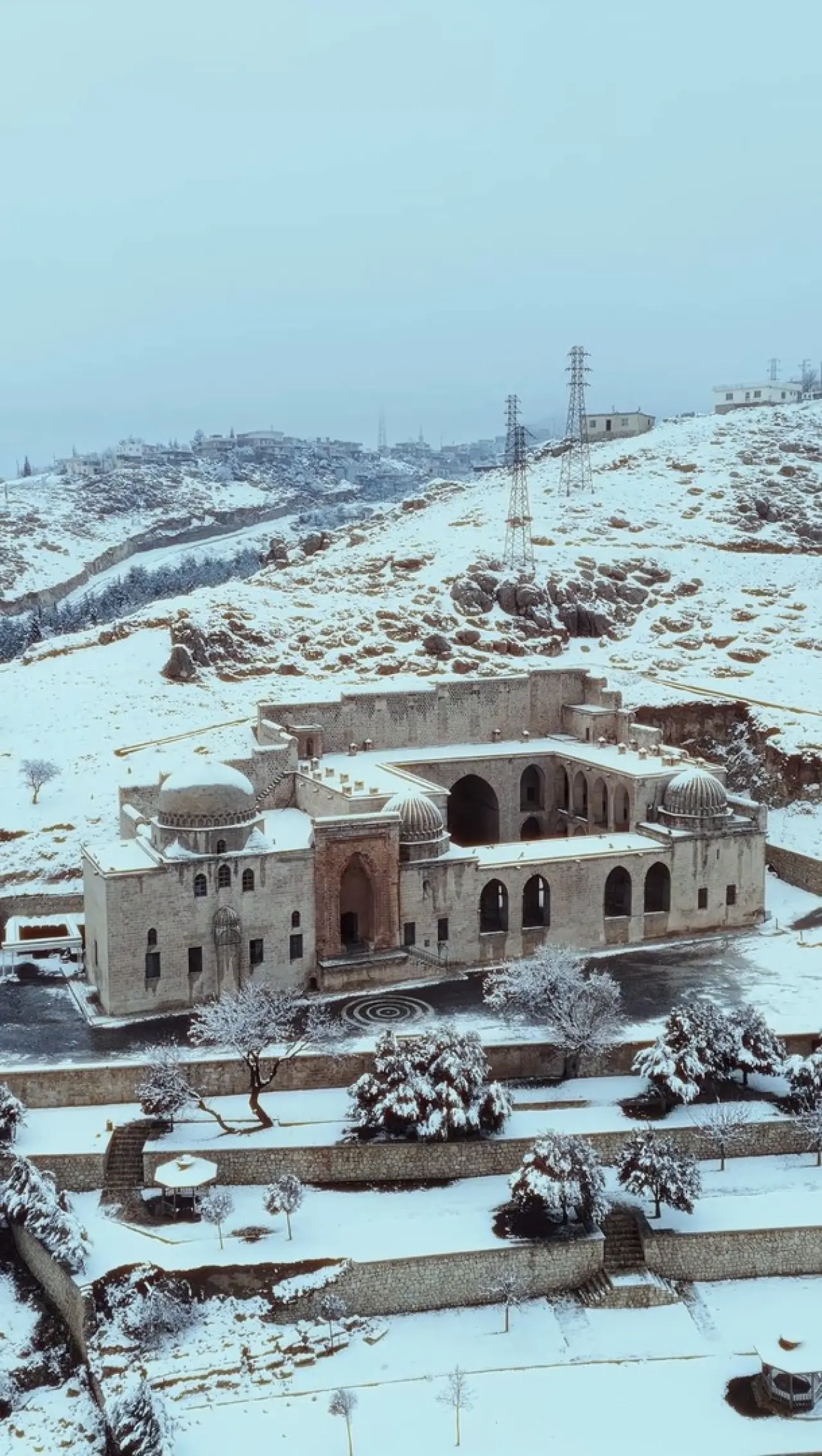 Mardin'deki tarihi Kasımiye Medresesi, yoğun kar yağışının ardından büyüleyici bir görünüme kavuştu. Drone ile çekilen görüntüler, medresenin karla kaplanmış halini gözler önüne serdi.