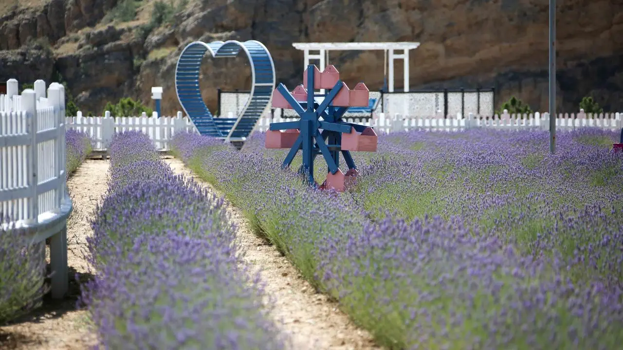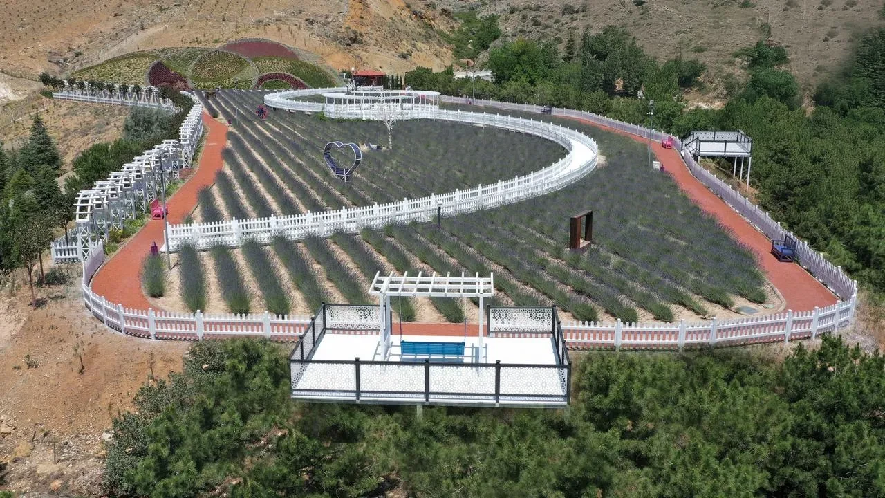 Dere Mahallesi'nde 20 bin metrekarelik alana yayılan bahçe, renkli görüntüsüyle dikkat çekiyor. Lavanta bahçesi içerisinde su havuzları, seyir terasları ve gül kemerleri bulunuyor.