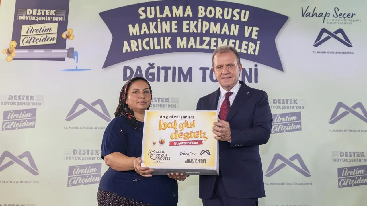 Mersin Büyükşehir Belediyesi, Akdeniz ve Toroslar ilçelerindeki üreticilere sulama borusu, makine ekipman ve arıcılık malzemeleri desteği sağladı.