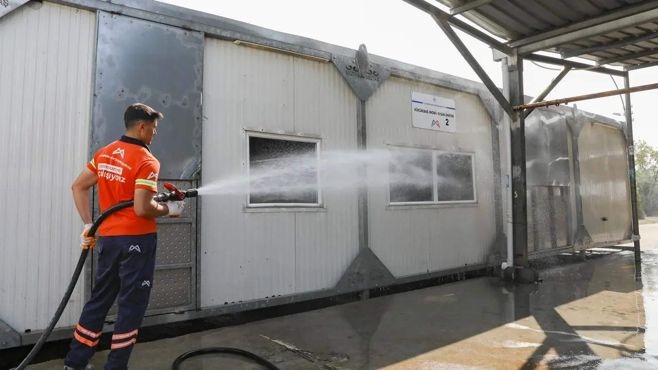 Belediye ekipleri 13 ilçede temizlik çalışmalarını titizlikle sürdürüyor. Mobil kesim üniteleri ve çevresi arazözlerle detaylı şekilde yıkanıyor.