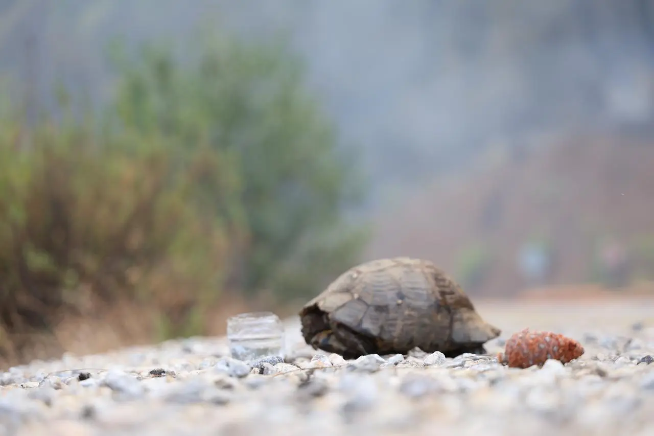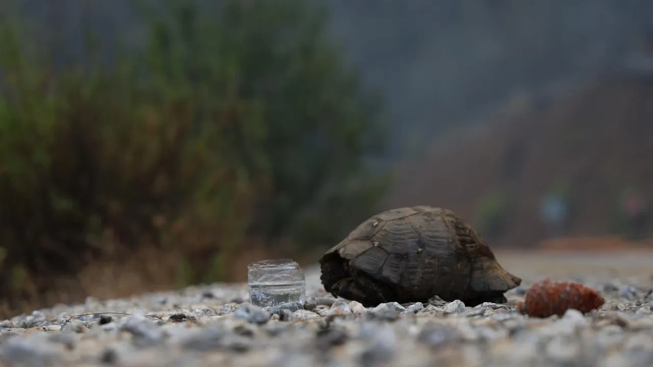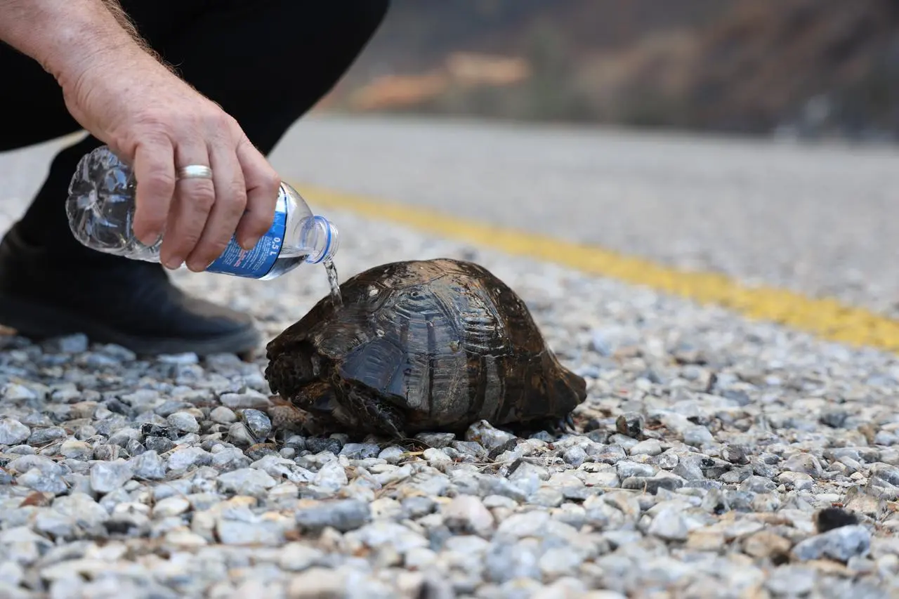 Yangın bölgesinde ateşten kaçan bir kaplumbağa, asfalt zemine sığındı ve uzun süre hareket etmedi. Yoldan geçenler tarafından su verilen kaplumbağa, objektiflere bu şekilde yansıdı.