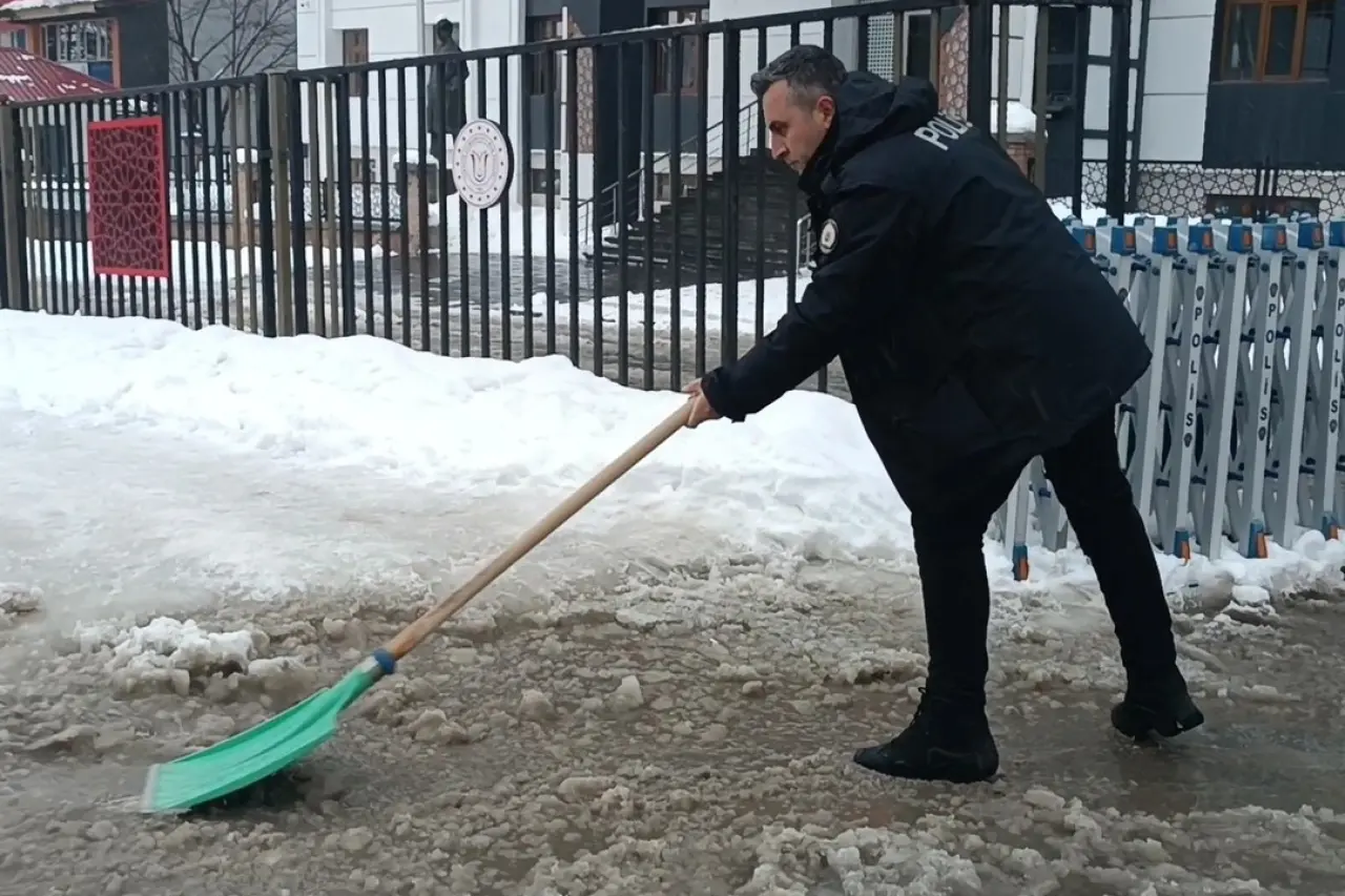 Muş'ta yoğun kar yağışı sonrası etkili olan su birikintisine polis müdahale etti. Caddeyi kürekle temizleyen polis memurunun davranışı takdir topladı.