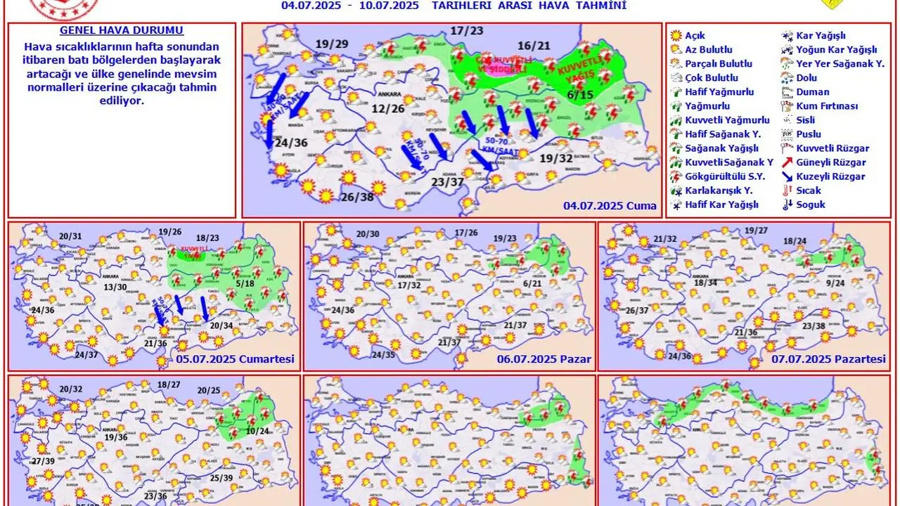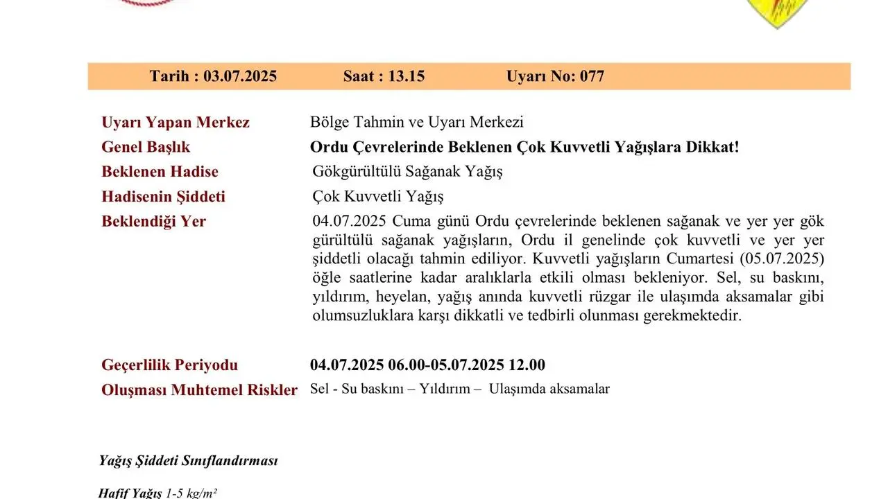 Meteoroloji Genel Müdürlüğü, Ordu'da 4-5 Temmuz tarihleri arasında şiddetli yağış beklendiğini duyurarak vatandaşları uyardı.
