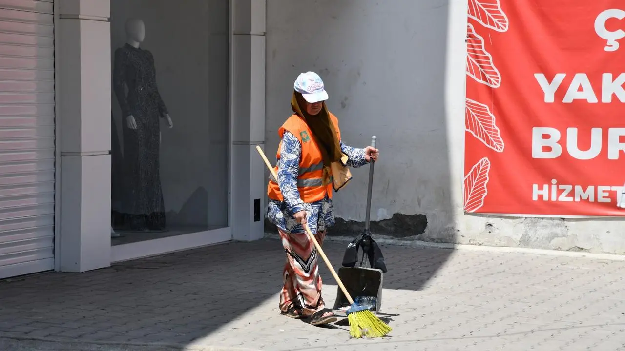 Ana arterlerde özel süpürge araçları kesintisiz çalışıyor. Kaldırımlar ve köşe noktalar el süpürgeleriyle detaylı temizleniyor.