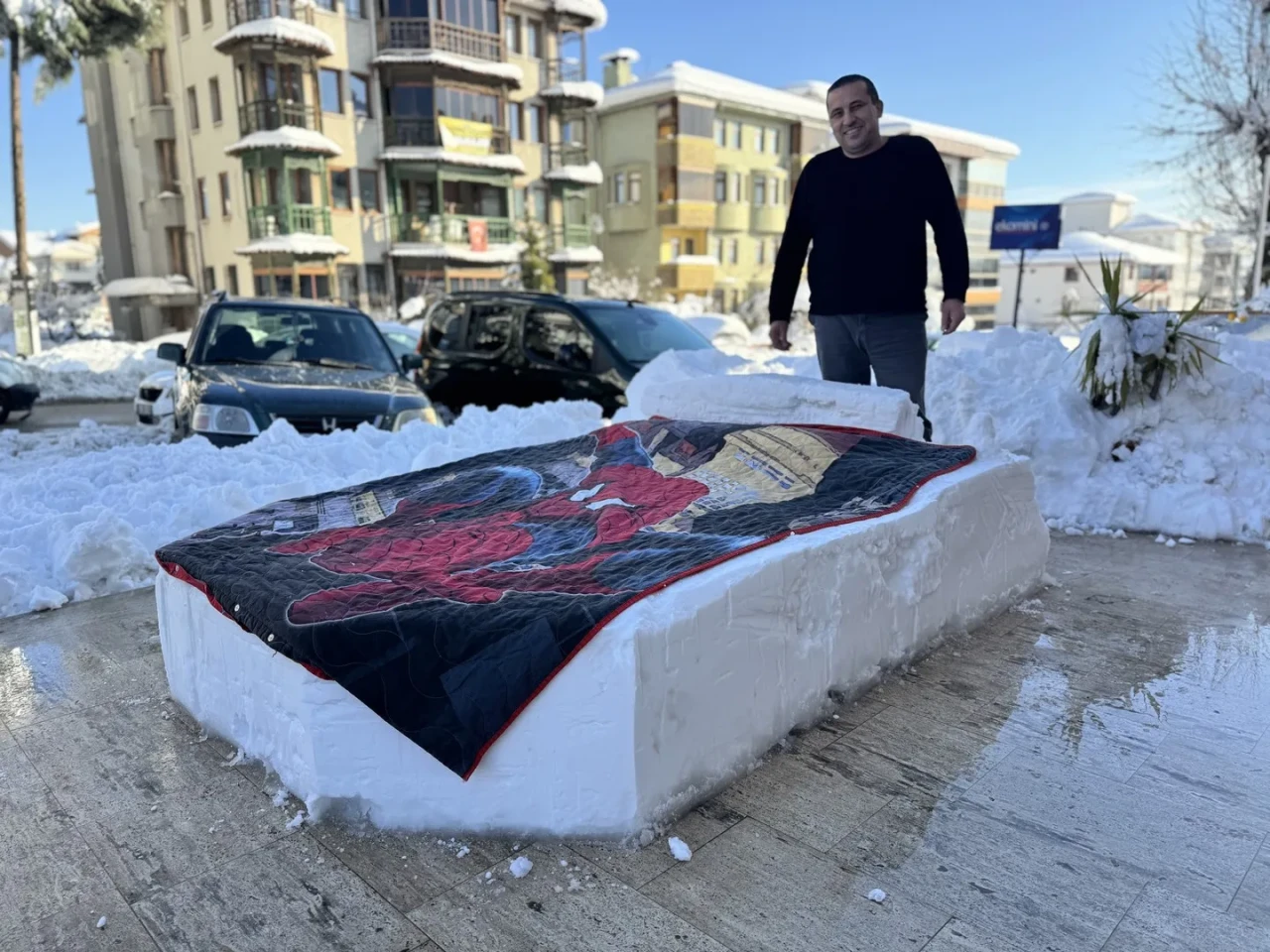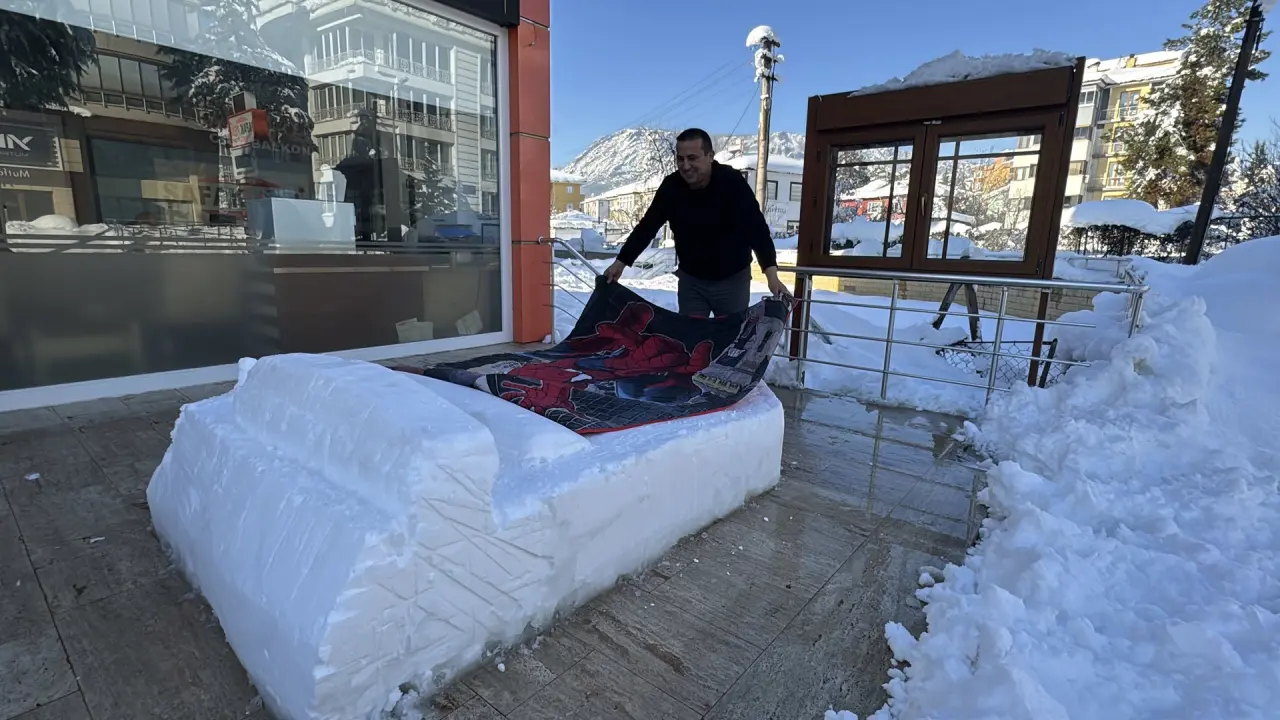 Özcan Doğangönül, dükkanının önündeki karları şekillendirerek yatak haline getirdi. Yatağın üzerine battaniye örten esnaf, ilginç görüntüler oluşturdu.