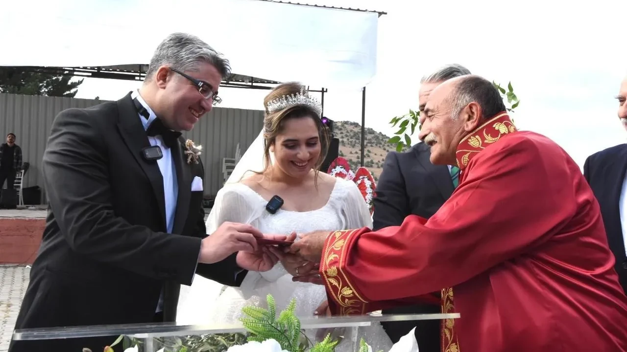 Belediye başkanı, kızı ve damadı için hayırlı bir evlilik diledi. Misafirlere teşekkür ederek evlilik cüzdanını takdim etti.