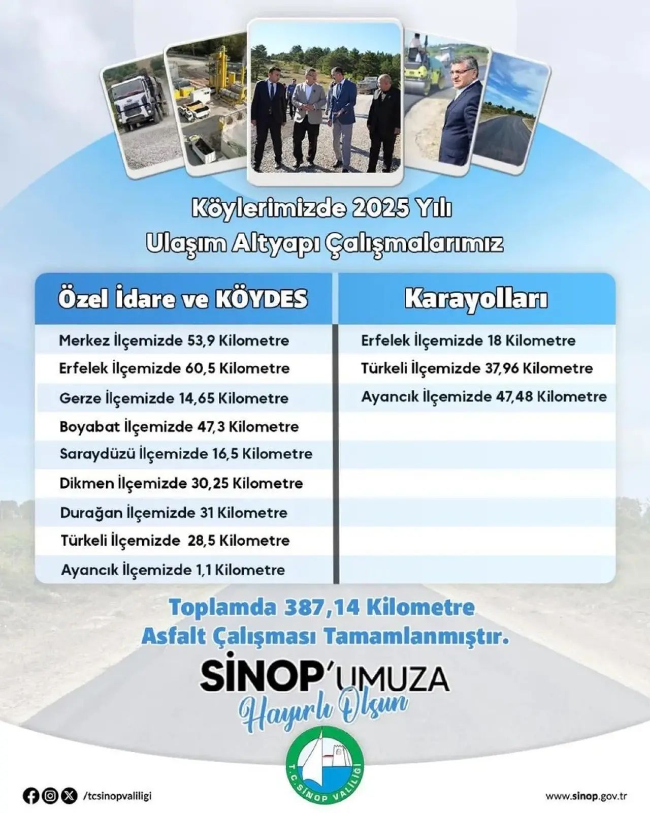 Sinop'ta kırsal bölgelere 387 kilometrelik asfalt çalışması tamamlandı, ulaşım altyapısı güçlendirildi.