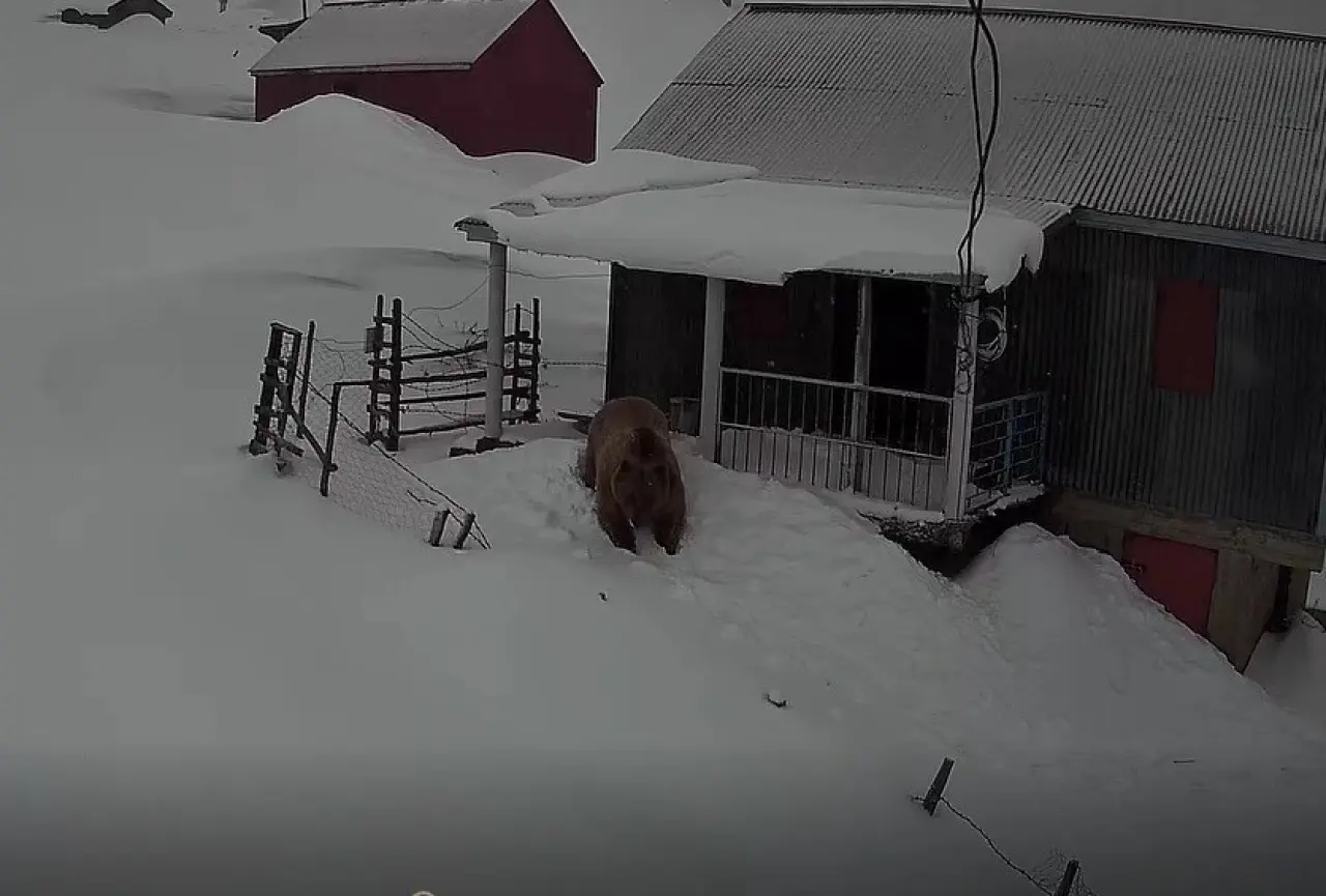 Sis Dağı Yaylası'nda kış uykusundan uyanan dev bir ayı, yayla evlerine dadandı. Güvenlik kamerasına yansıyan görüntüler, ayının rahat tavırlarını ortaya koydu.