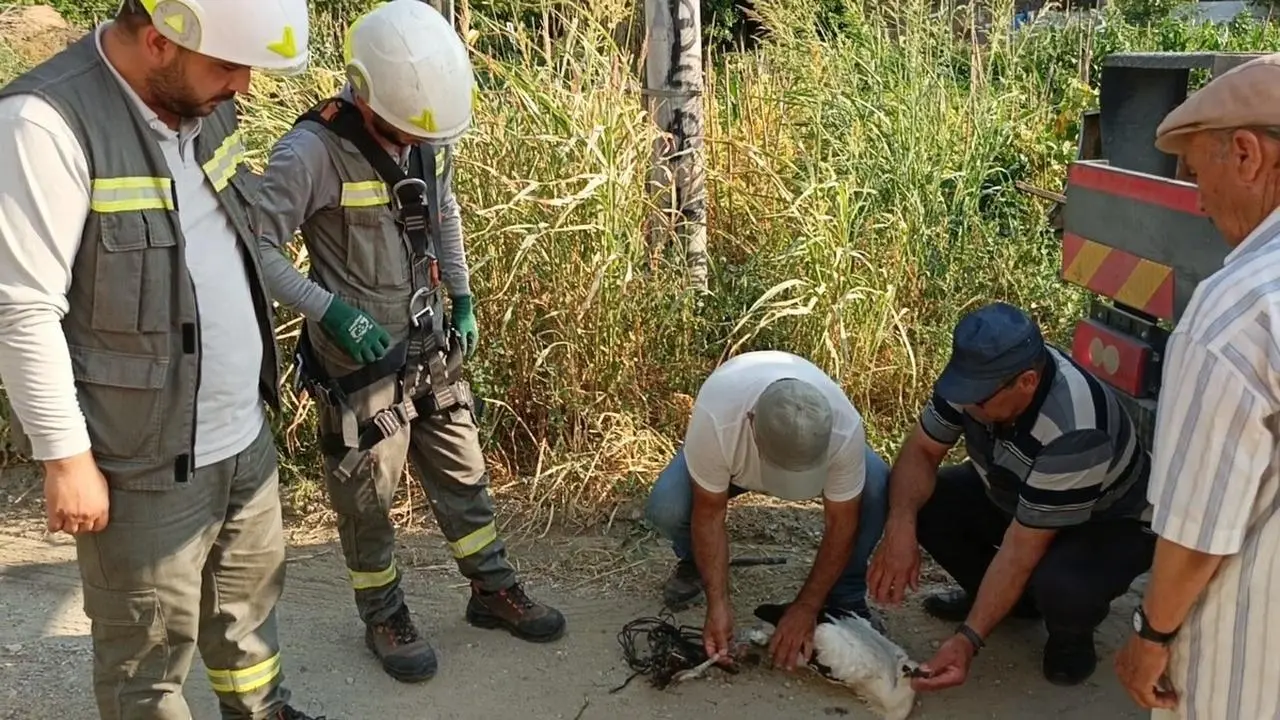 ADM Elektrik Dağıtım Şirketi'nin BOM aracı yuvalara ulaşımı sağladı. Ekipler, leyleğin ayağına dolanan plastik ipleri temizleyerek yavruyu kurtardı.