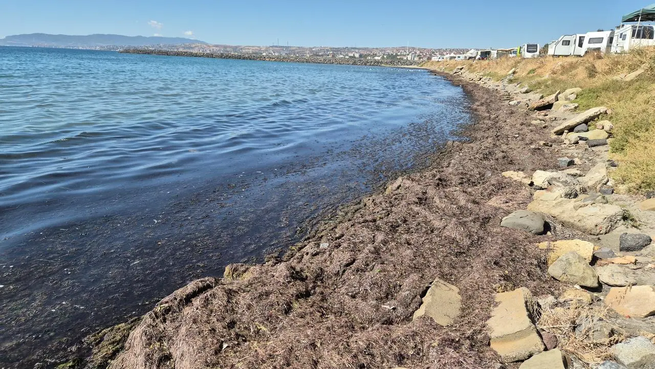 Tekirdağ'ın Süleymanpaşa sahilinde kızıl yosunlar kıyıya vurdu ve keskin bir koku oluştu.