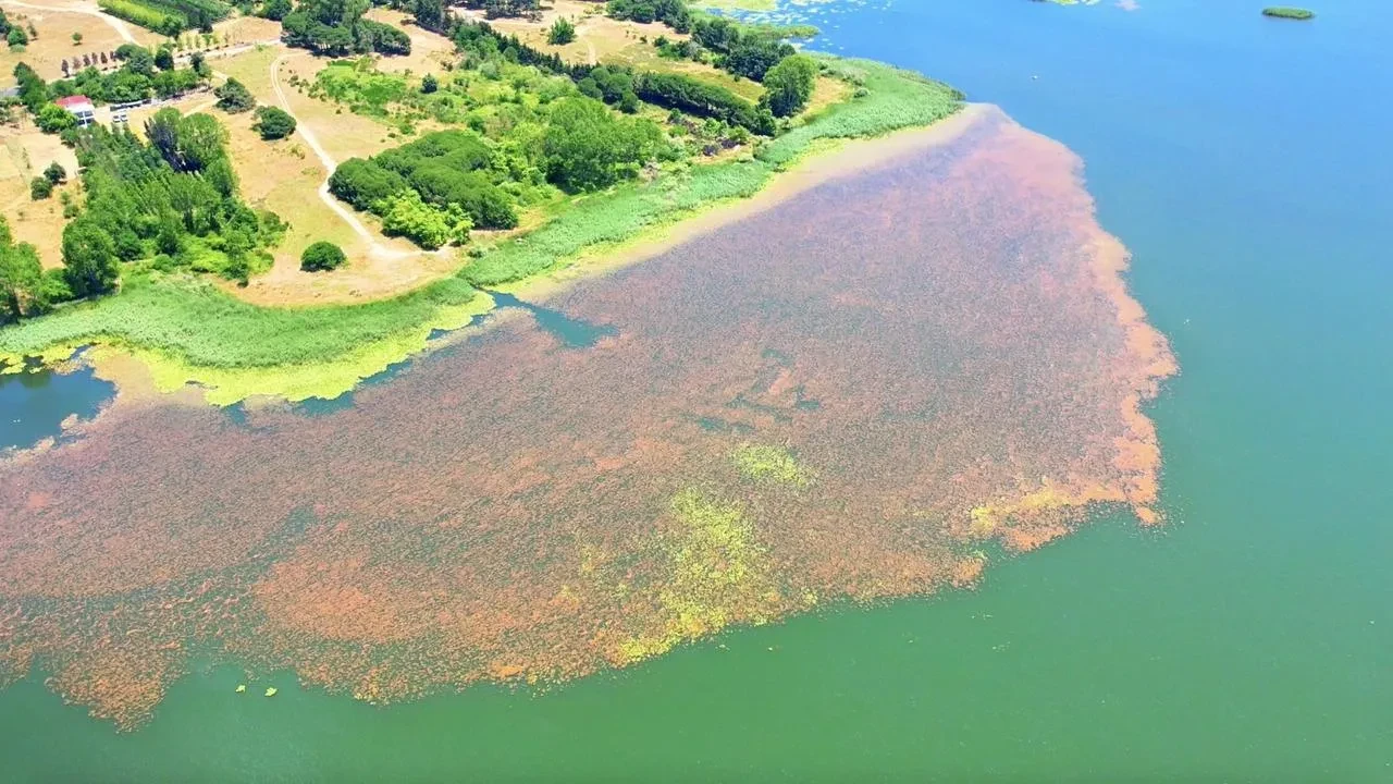 Terkos Gölü'nün yüzeyi ilkbahar aylarında yeşil ve pembe tonlarıyla kaplanıyor. Göl üzerindeki bitki örtüsü, eşsiz bir görsel şölen sunuyor.