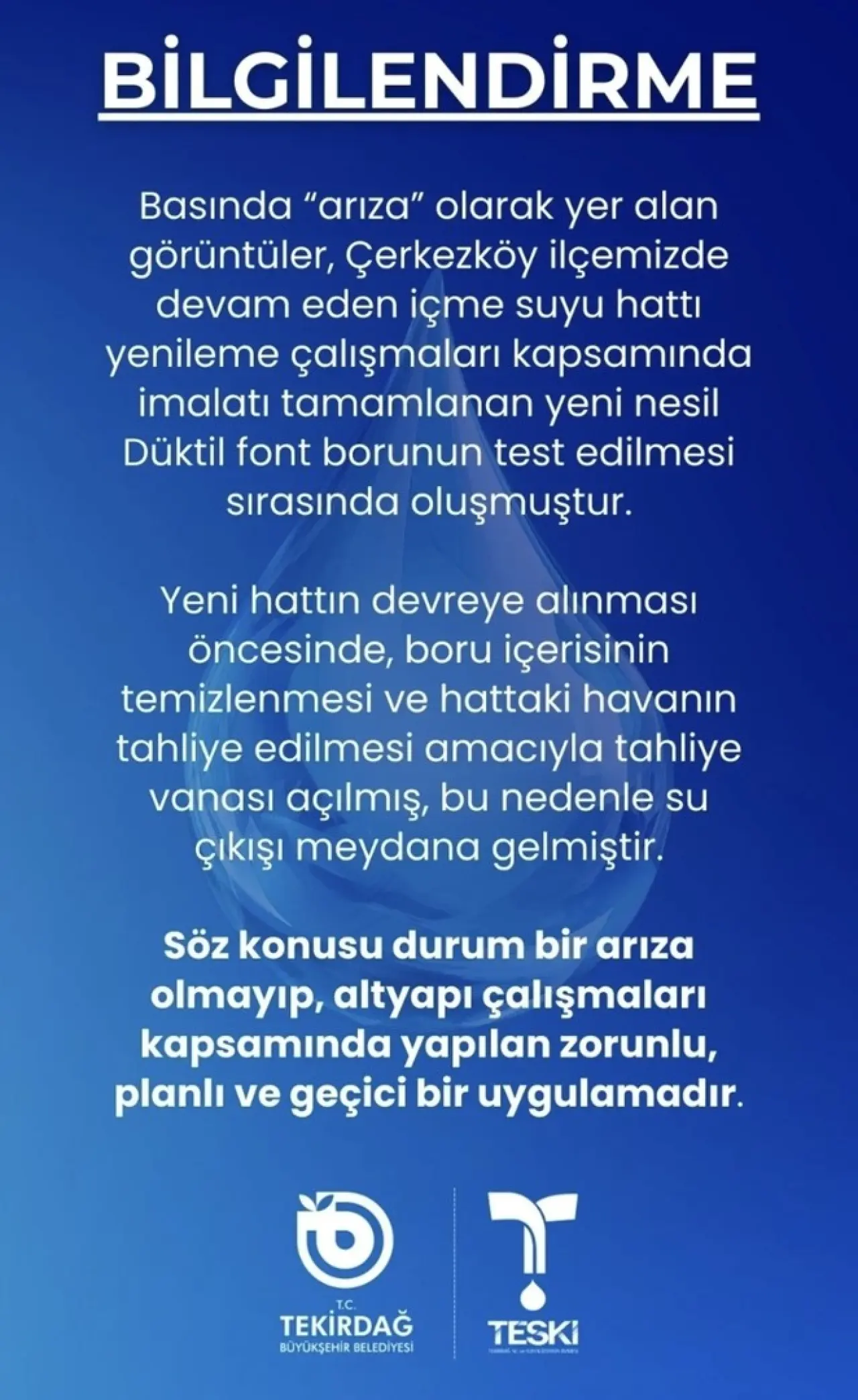 TESKİ, Çerkezköy'de içme suyu hattı yenileme çalışmaları kapsamında kontrollü su tahliyesi yaptığını açıkladı.