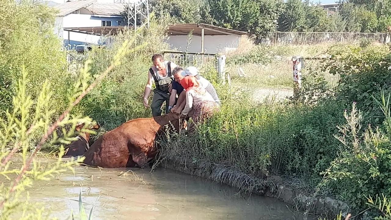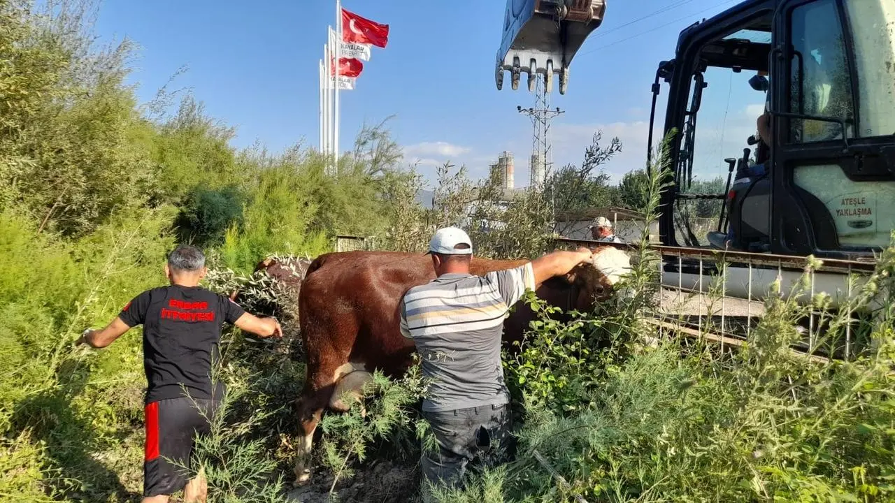 Olay yerine gelen ekipler, iş makinesi desteğiyle çalışma yaptı. Yaklaşık 1 saat süren müdahale sonucu inekler sağ salim kurtarıldı.