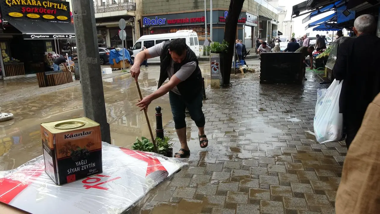Trabzon'da şiddetli yağış sonrası taşan dereler nedeniyle iş yerleri sular altında kalırken esnaf temizlik çalışmalarına başladı.