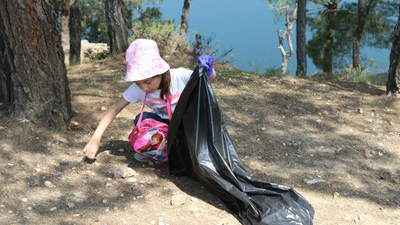 Gölet kıyısında ve ormanlık alanda öğrenciler atıkları topladı. Öğretmenler de öğrencilere eşlik ederek çevre temizliğine destek verdi.