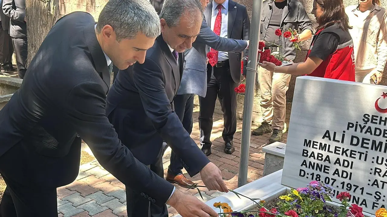 Şehitlik ziyaretine üst düzey yetkililer katılım gösterdi. Vali Aktaş'ın yanı sıra milletvekilleri ve belediye başkanı hazır bulundu.
