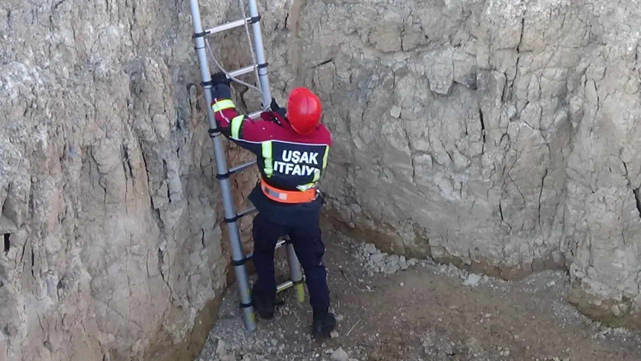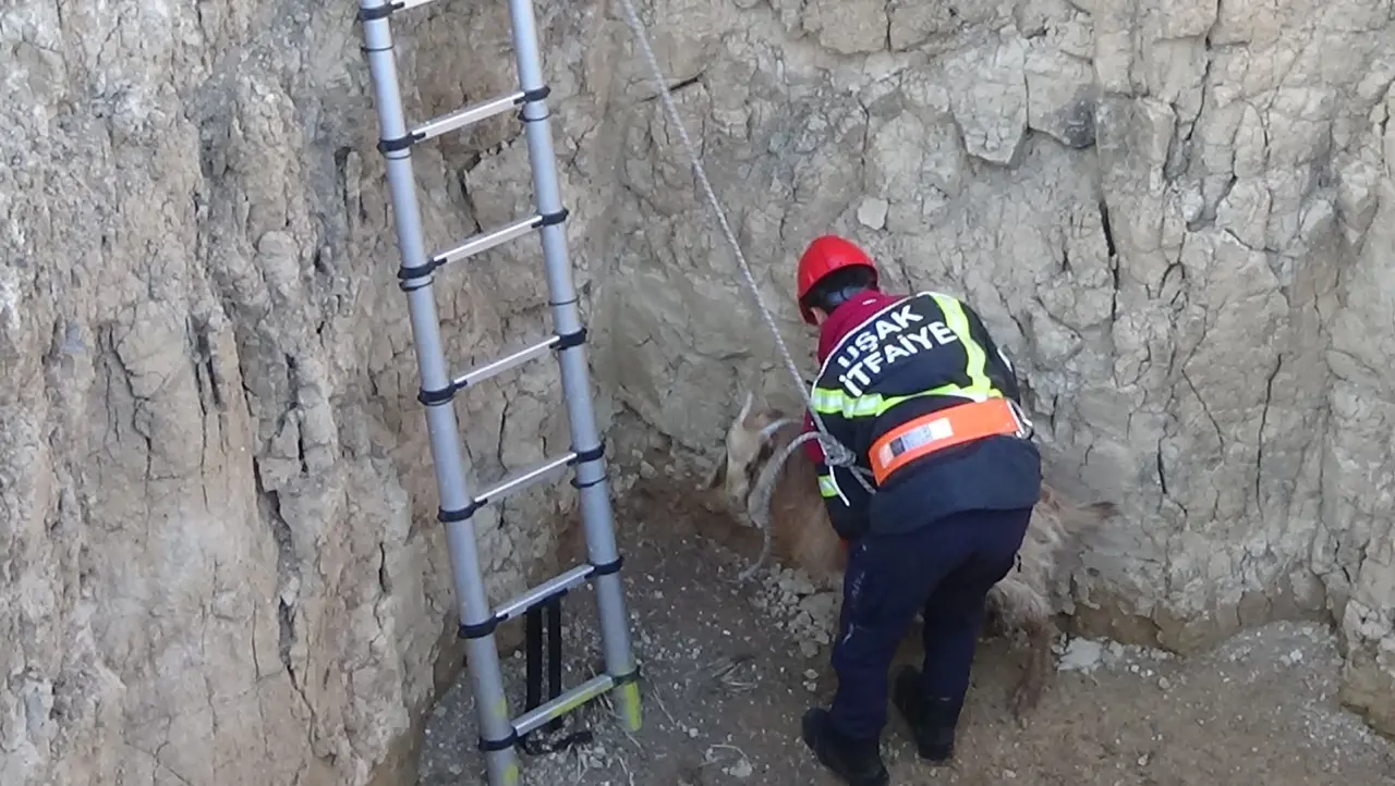 Uşak'ta dört metrelik çukura düşen keçi, itfaiye ekiplerinin müdahalesiyle kurtarıldı.