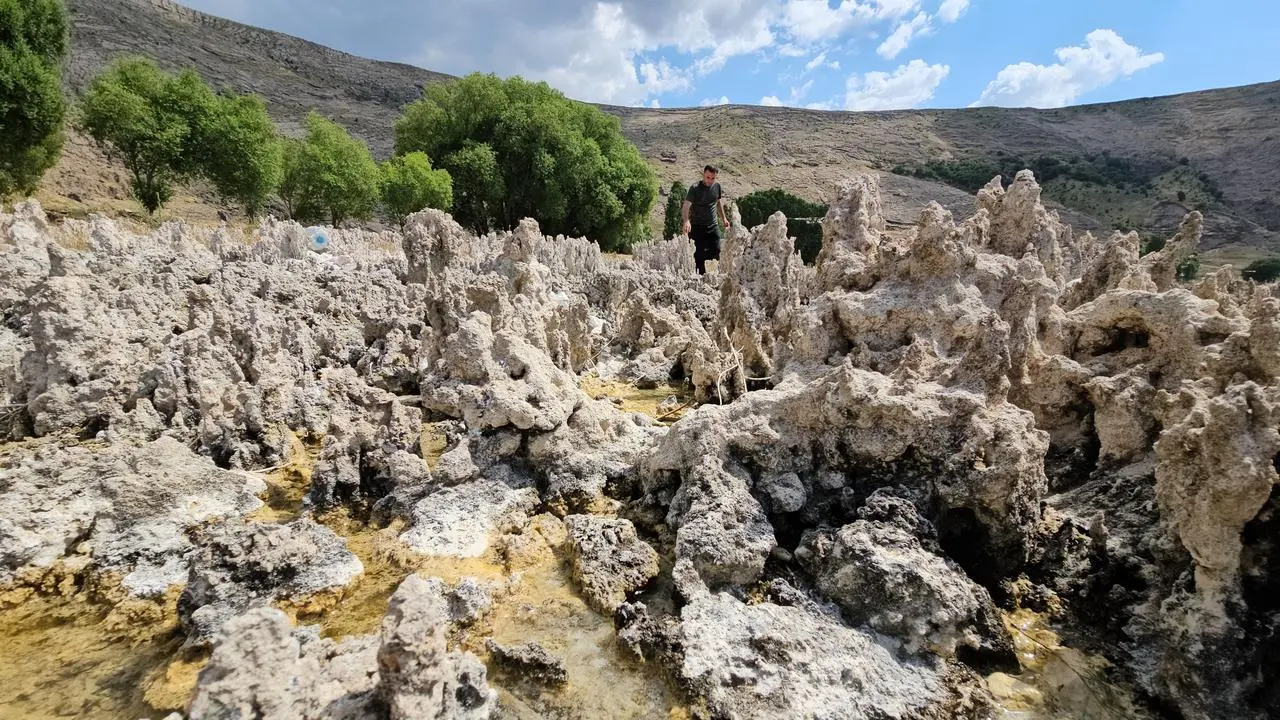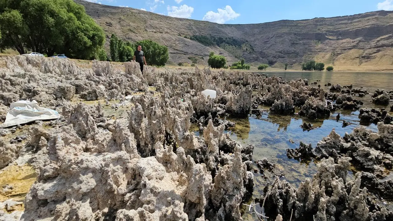 Van Gölü'nün Tatvan sahillerinde su çekilmesi sonucu yüzlerce mikrobiyalit yapısı gün yüzüne çıktı.