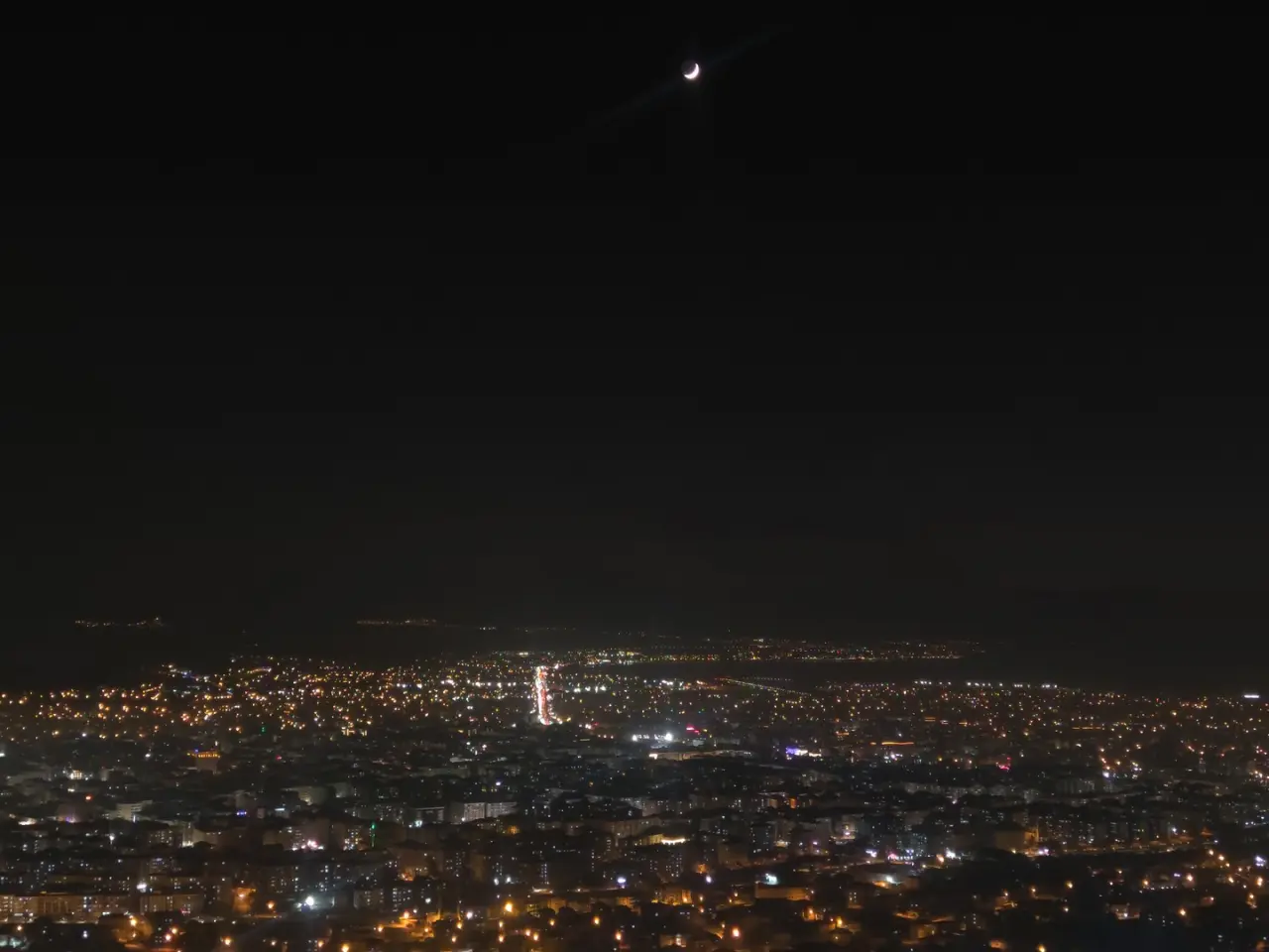 Gece ışıklarıyla aydınlanan hilal, şehir siluetine ayrı bir güzellik kattı. Kartpostallık kareler, doğa ve gökyüzünün uyumunu yansıttı.