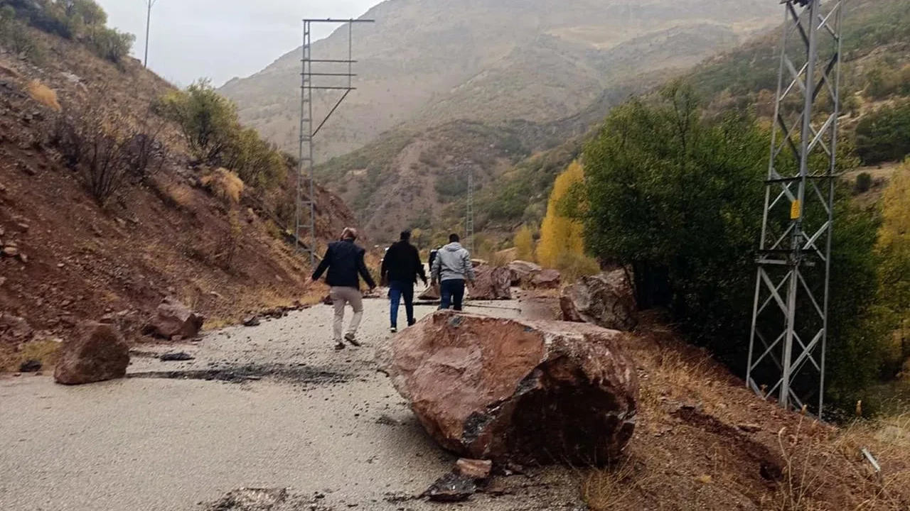 Van’ın Çatak ilçesinde şiddetli yağışlar sonrası dağlık alandan kaya parçaları yola düştü.