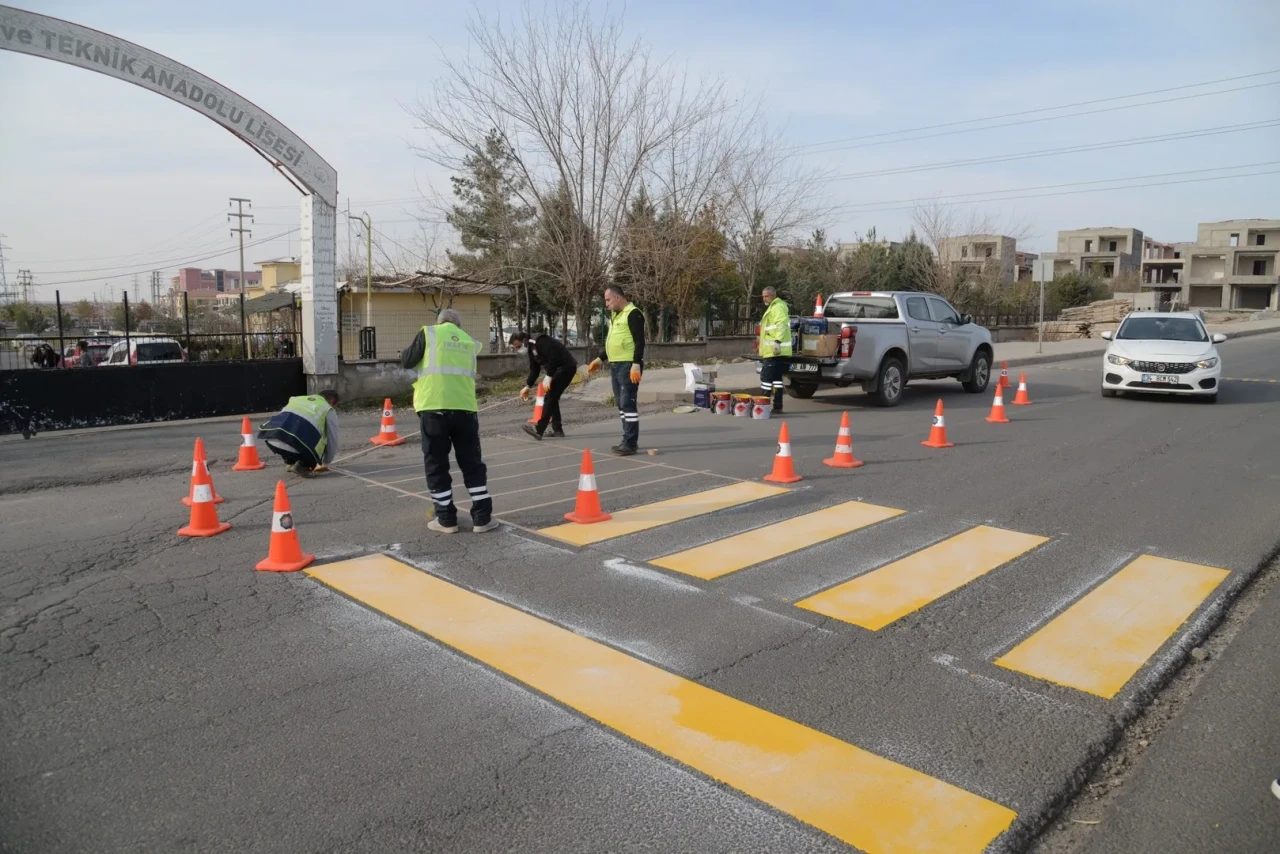 Barış Mahallesi'ndeki lise önüne yaya güvenliği için yeni geçit çizgileri eklendi. Trafik akışı ve can güvenliği iyileştirildi.
