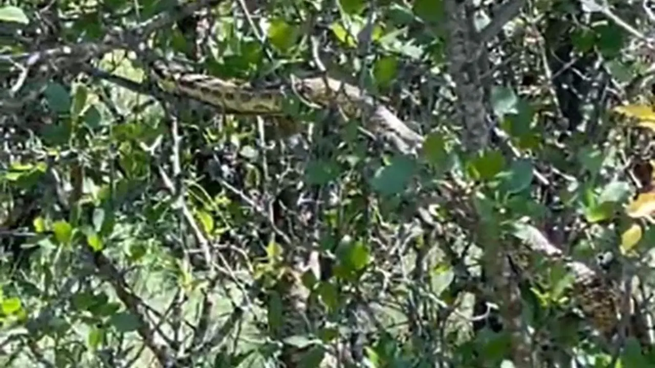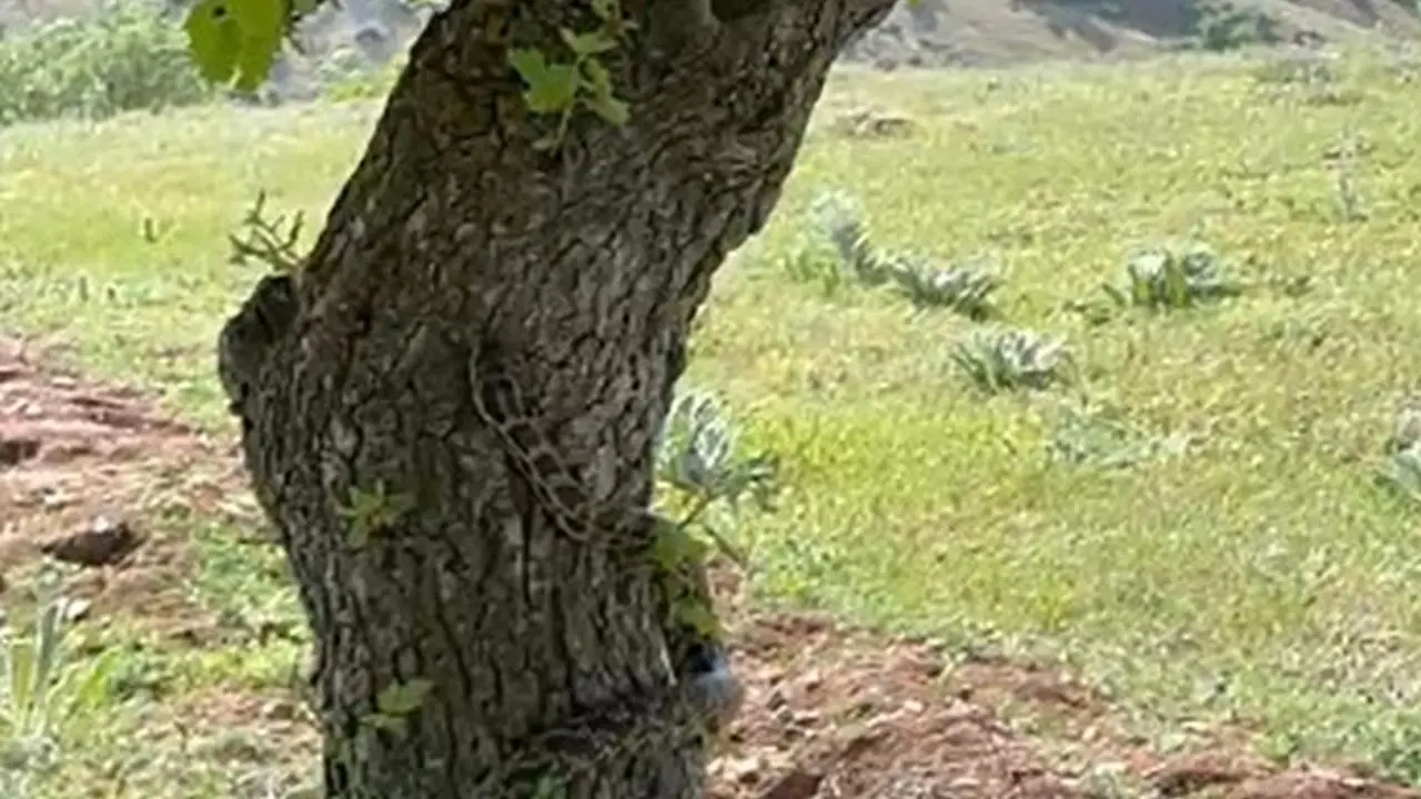 Yozgat'ın Saraykent ilçesinde hayvan otlatan besici, dinlenmek için oturduğu ağaçta dev bir yılanla karşılaştı ve anı kaydetti.