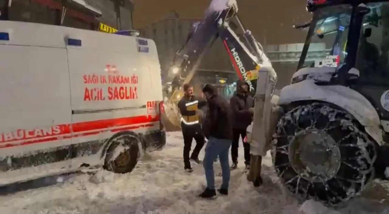 İl Özel İdaresi ekipleri iş makinesiyle ambulansı kurtardı. Kar mücadele çalışmaları bölgede yoğun şekilde devam ediyor.