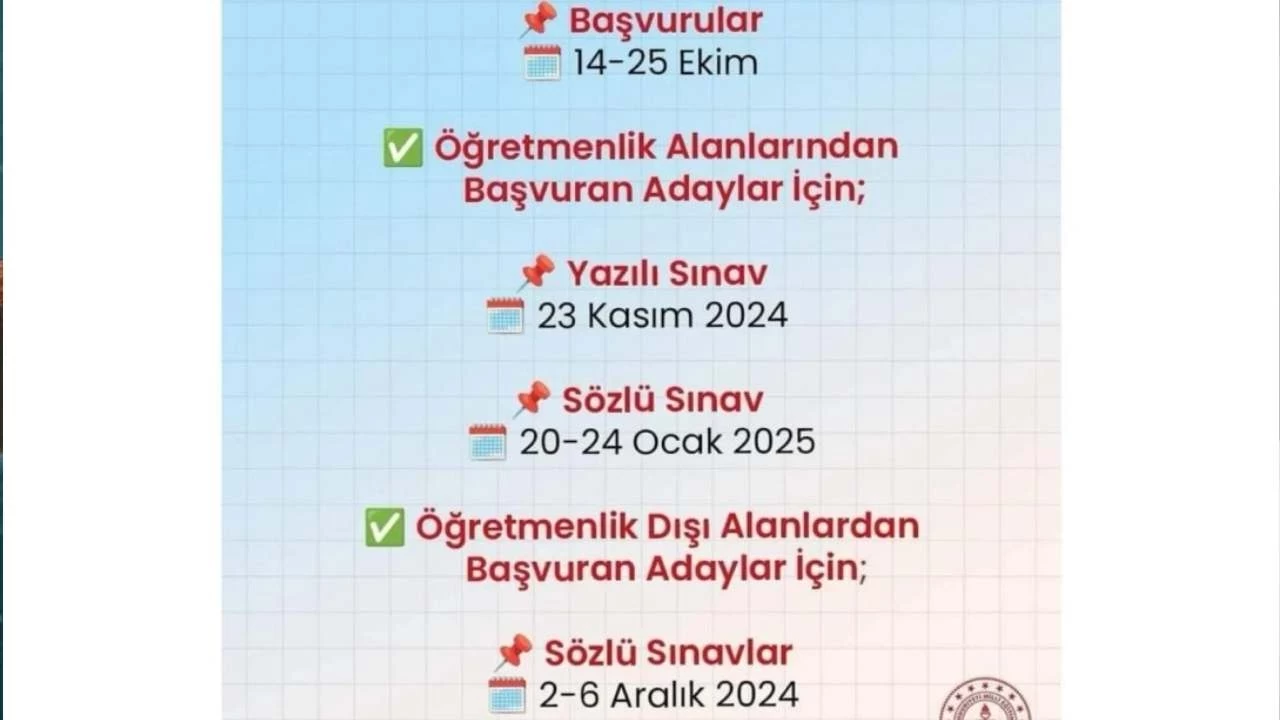 Öğretmenlik alanında başvuru yapacak adayların, öğretmenlikte en az 8 yıllık deneyime sahip olması ve 35 yaşını doldurmamış olması gerekmektedir. Adayların bu süre içinde resmi veya özel eğitim kurumlarında öğretmen ya da yönetici olarak çalışmış olmaları dikkate alınacaktır. Ayrıca askerlik hizmetini temel eğitim sonrasında öğretmen olarak tamamlayanların bu süreleri de değerlendirmeye alınacaktır. Yazılı sınav 23 Kasım 2024 tarihinde Ankara'da gerçekleştirilecek olup, başarılı olan adaylar sözlü sınava katılmaya hak kazanacaklar.