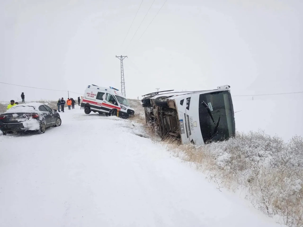 Kar yağışının etkili olduğu bölgede servis minibüsü şarampole devrildi. Araçtaki 5 işçi kazadan yara almadan kurtulmayı başardı.
