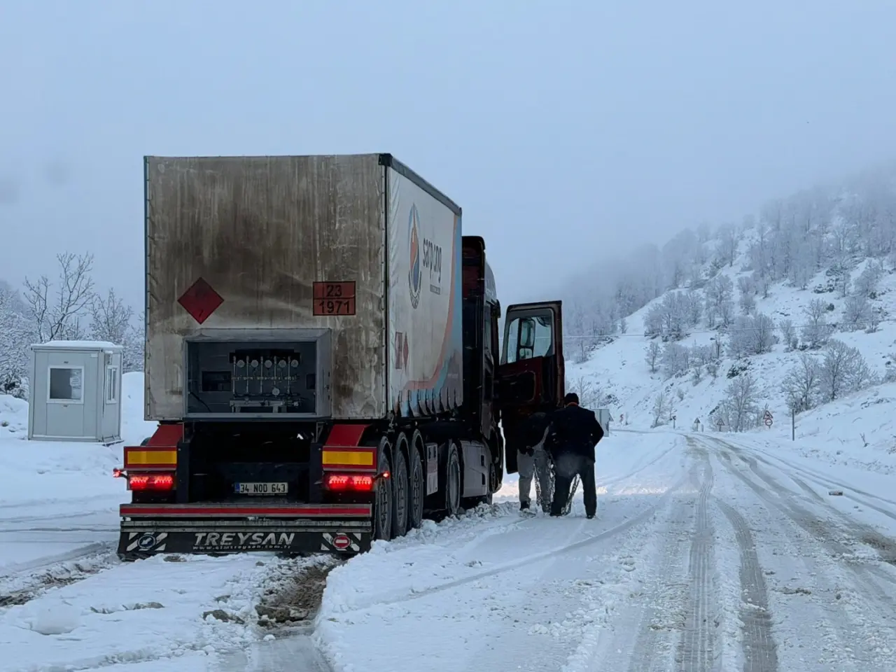 Karlı yolda ilerleyemeyen sürücüler araçlarını kenara çekmek zorunda kaldı. Zorlu koşullarda mahsur kalan vatandaşlar, iş makinelerinin müdahalesi sonrası yollarına devam edebildi.
