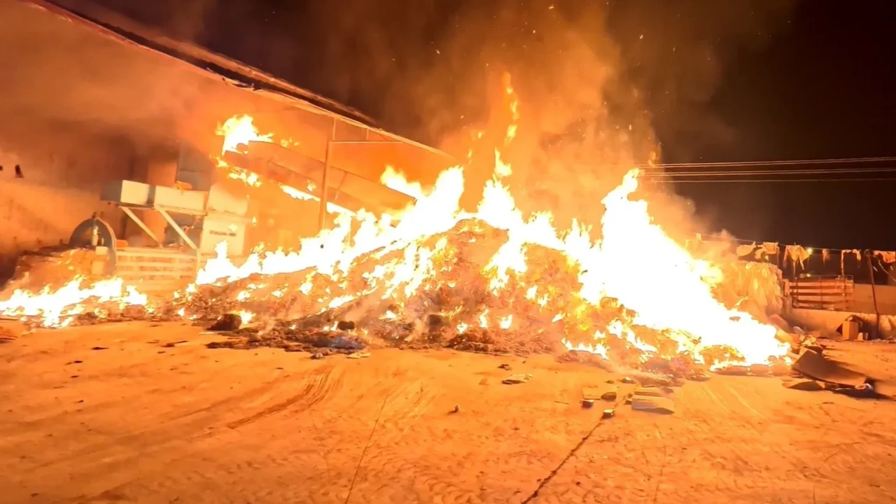Aksaray'da bir geri dönüşüm tesisi kundaklanarak büyük bir yangına neden oldu. Plastik ve kağıt balyaları dakikalar içinde alev topuna döndü.