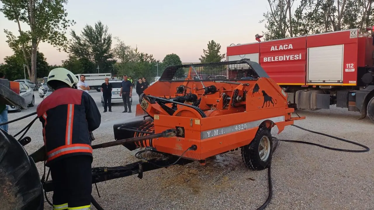 Çorum'un Alaca ilçesinde tarlada çalışan sap balya makinesi aniden alev alarak itfaiye ekiplerinin müdahalesiyle söndürüldü.