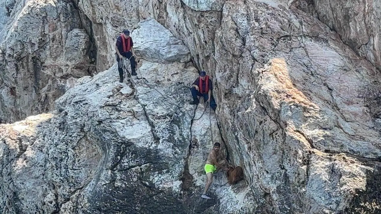 Sahil Güvenlik Antalya Grup Komutanlığı ekipleri sarp kayalıklarda titiz bir çalışma başlattı. Zorlu arazi koşullarına rağmen keçiye ulaşmayı başaran ekipler, hayvanı güvenli şekilde bulunduğu yerden aldı.