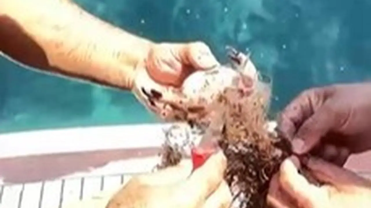 Tekne kaptanı Turgay Meşe ve turistler, dalış sırasında ağa dolanan yengeçleri fark etti. Hemen harekete geçerek yengeçleri sudan çıkardılar.
