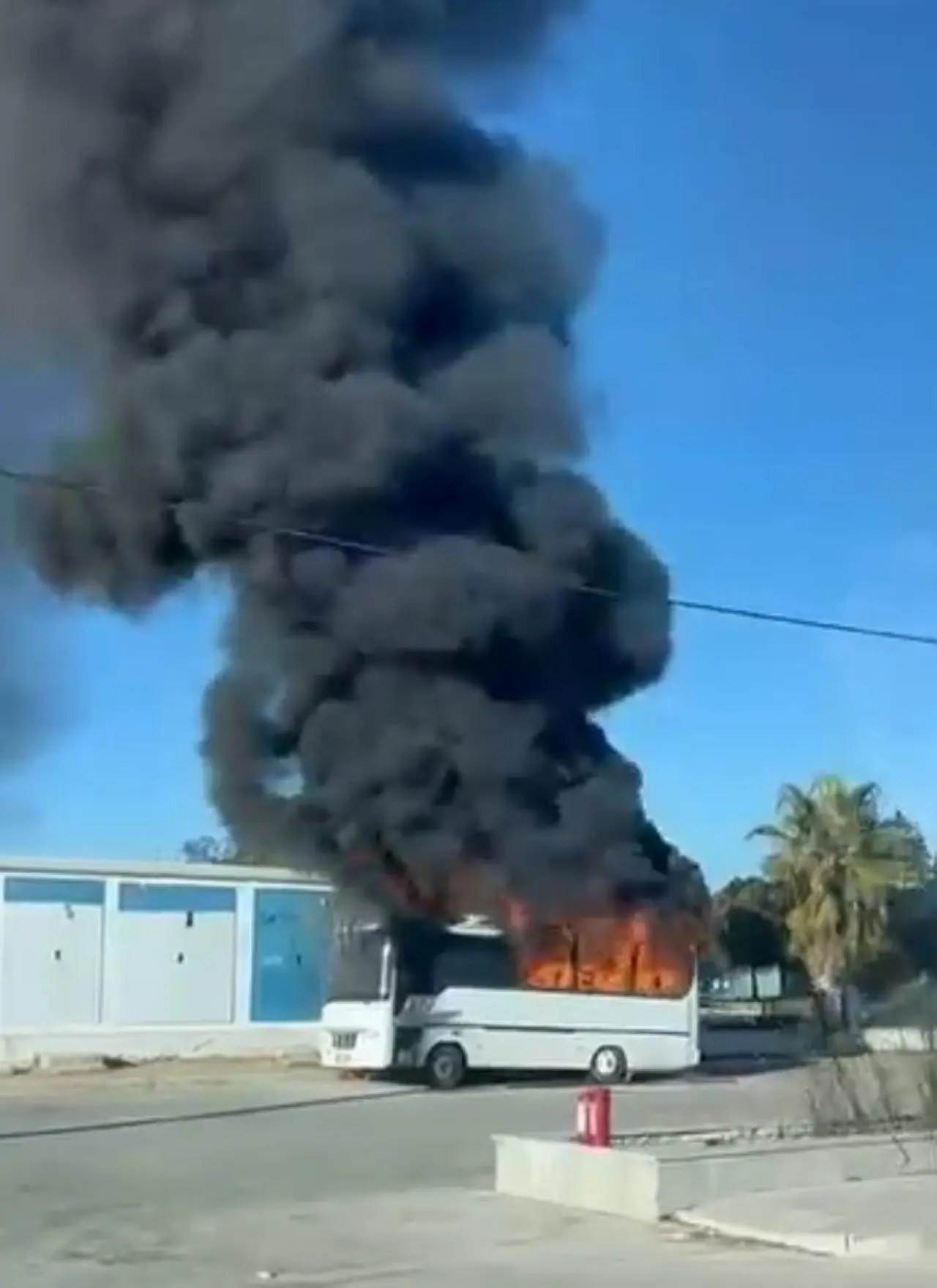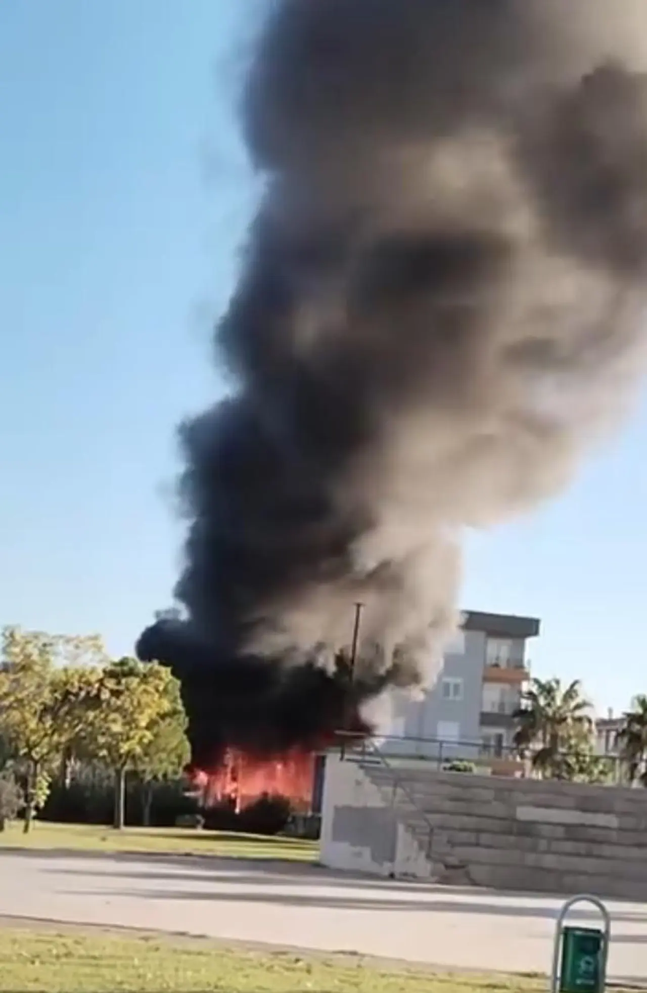 Antalya'nın Serik ilçesinde park halindeki bir midibüs bilinmeyen bir nedenle alev alarak tamamen yandı.