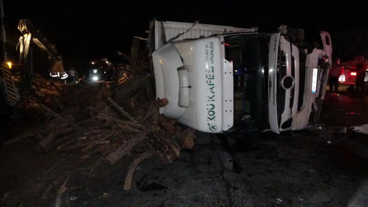 D-400 Karayolu'nda meydana gelen kazada kırmızı ışıkta bekleyen araca çarpan kamyon devrildi. Çarpmanın etkisiyle yola saçılan odunlar trafiği felç etti.