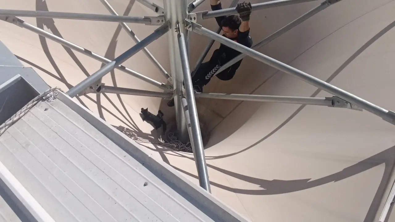 Antalya'nın Manavgat ilçesinde pazar yerinin çatısına sıkışan kedi itfaiye ekipleri tarafından kurtarıldı.