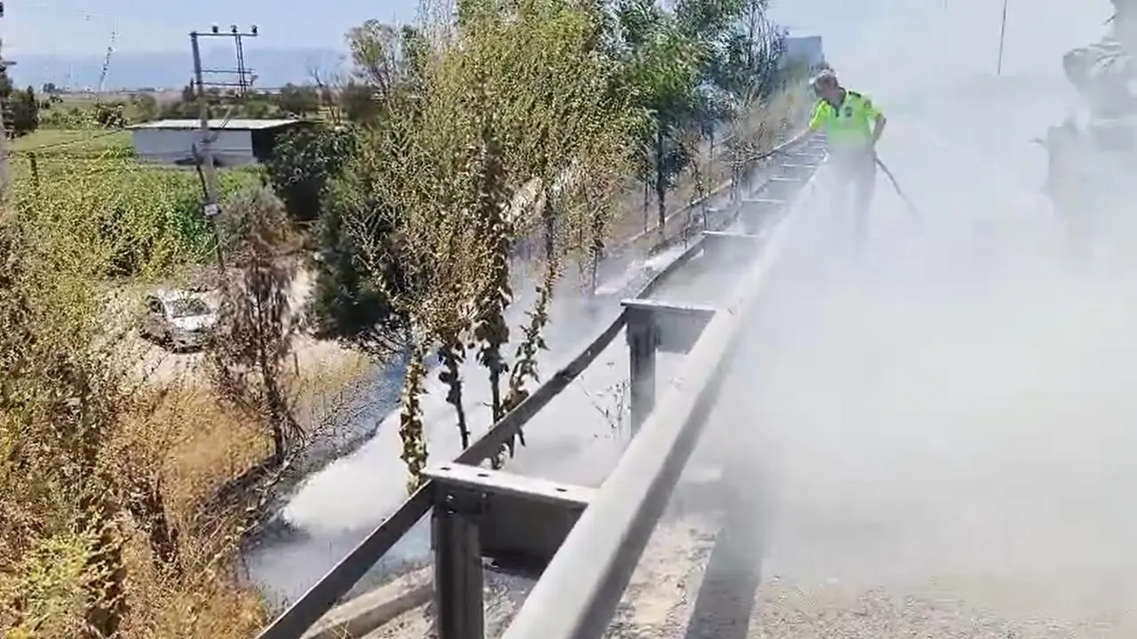 Polis ekipleri, itfaiye gelene kadar yangının yayılmasını önlemek için pratik bir çözüm buldu. Yoldan geçen beton mikserini durdurarak içindeki suyu yangın söndürmede kullandılar.