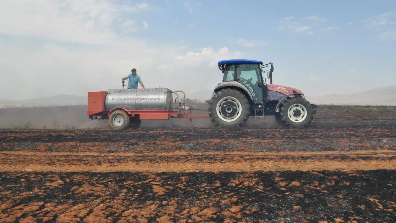 Isparta'nın Yalvaç ilçesinde balya makinesinden çıkan kıvılcım, 100 dönümlük tarım arazisini yok etti. Köylüler, traktörlerle müdahale ederek yangını kontrol altına aldı.