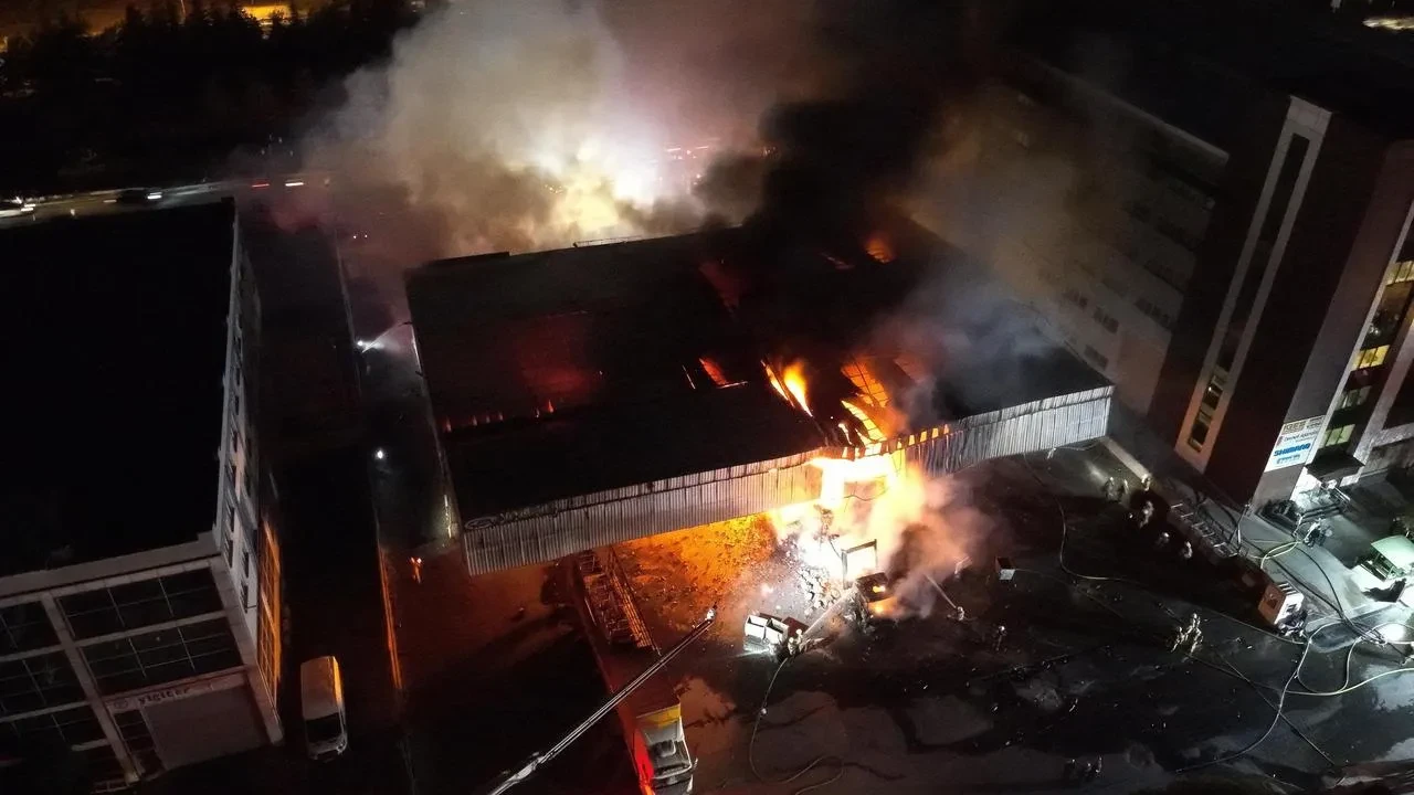Drone görüntülerinde deponun tamamen alevler içinde kaldığı görüldü. Polis ekipleri güvenlik önlemi olarak çevreyi kordon altına aldı.