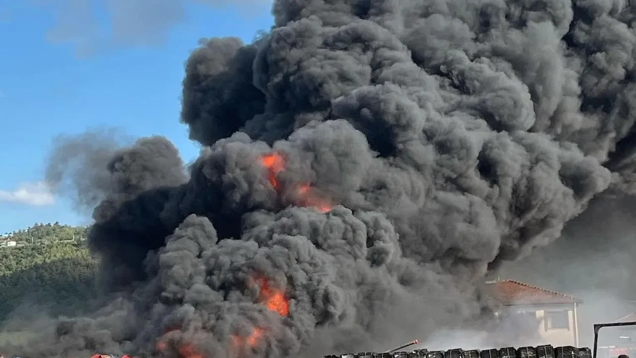 Bilecik'te soğuk hava deposu önündeki plastik kasaların tutuşması sonucu yükselen siyah dumanlar gökyüzünü kapladı.