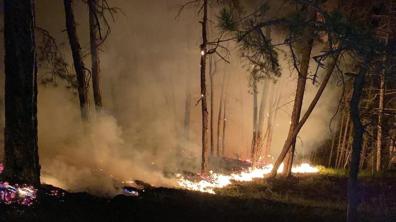 Yangın kontrol altına alınmak için beklerken alevler geceyi aydınlatıyor. Ekipler gece boyunca söndürme çalışmalarını sürdürüyor.