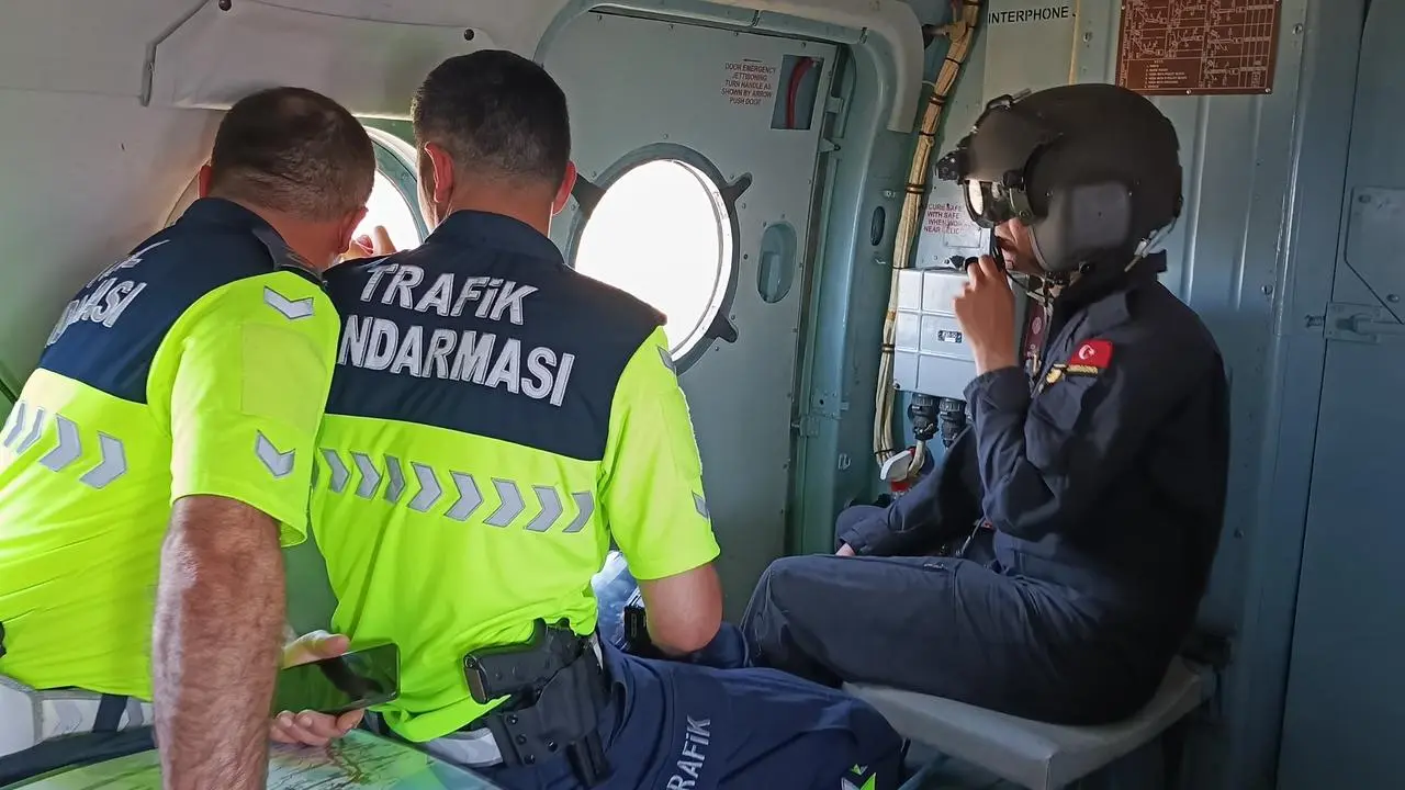 Bursa'da bayram tatili süresince jandarma ekipleri, helikopter desteğiyle yoğun trafik denetimlerini havadan ve karadan gerçekleştiriyor.